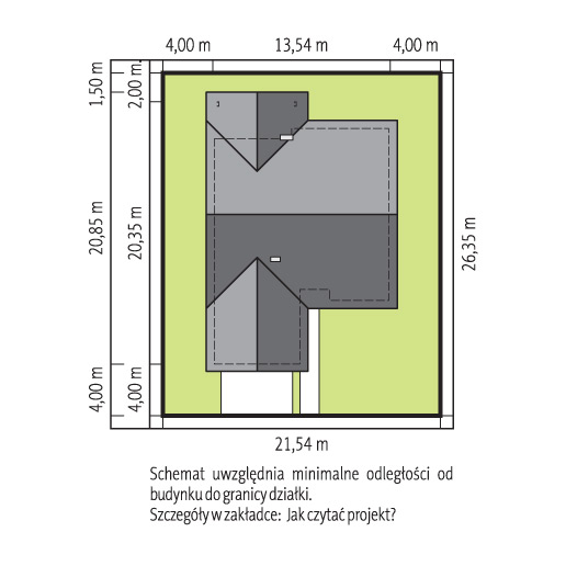 Wejście przez wiatrołap do holu. Z holu dostępne są kuchnia z jadalnią, pokój dzienny i w.c. Do kotłowni wchodzi się z wiatrołapu, a do garażu z zewnątrz. Schody prowadzą do przedpokoju-galerii, skąd dostępne są 3 sypialnie, garderoba i łazienka. Zasadniczą bryłę budynku tworzą 2 przenikające się prostopadłościany o horyzontalnym układzie. Całość przykrywa dach wielospadowy o kącie nachylenia połaci 45°. Bryłę wzbogaca podcień wejścia akcentowany lukarną.