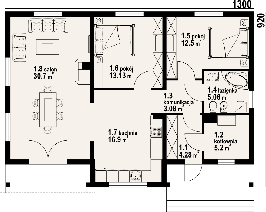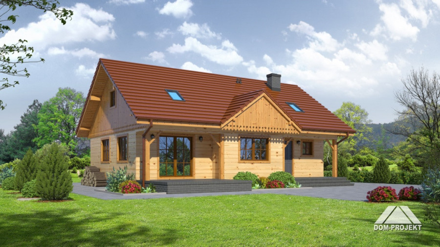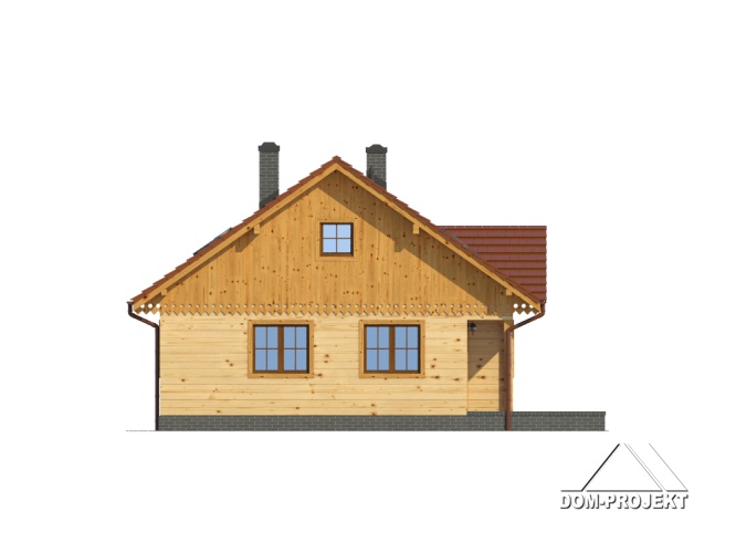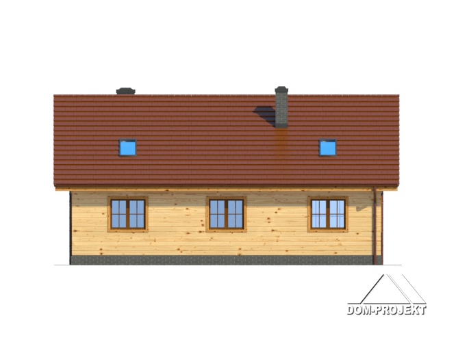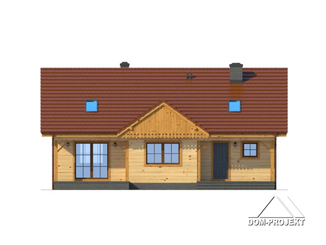 Nieduży dom parterowy w technologii szkieletowej. Idealny na działkę z wejściem od południa. Program użytkowy domu stanowią: duży salon z kominkiem i wyjściem na taras, otwarta kuchnia, dwa pokoje, łazienka, komunikacja, wiatrołap oraz kotłownia.