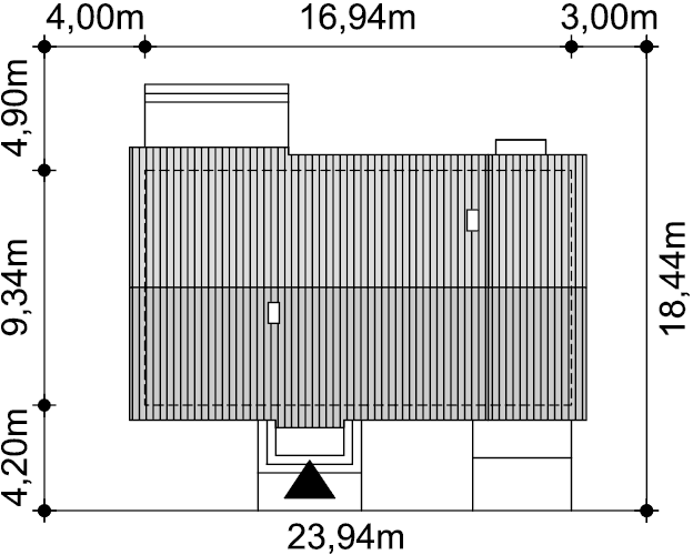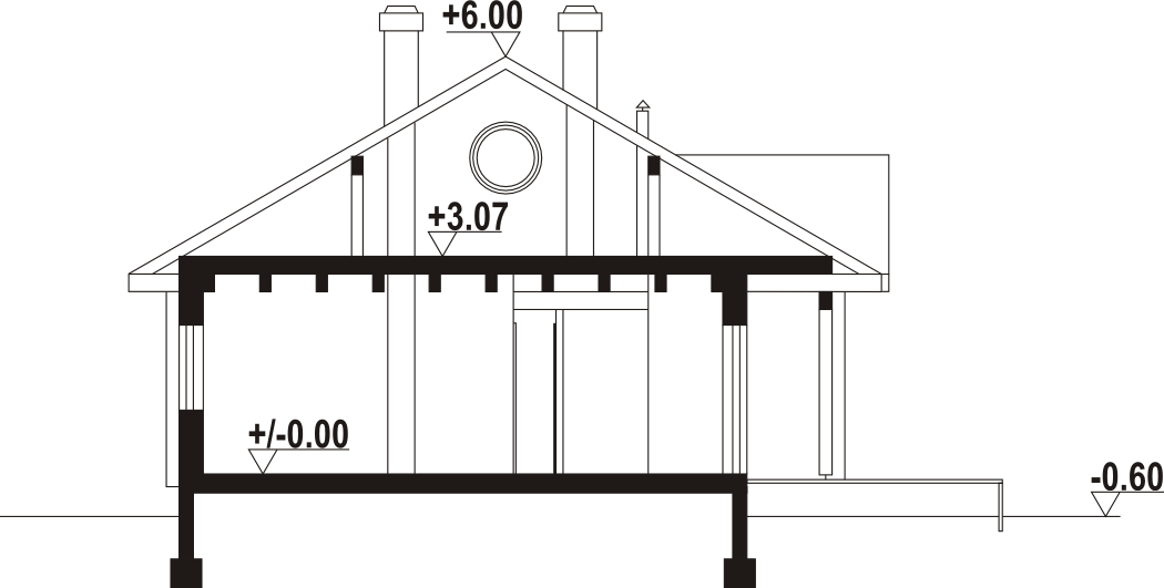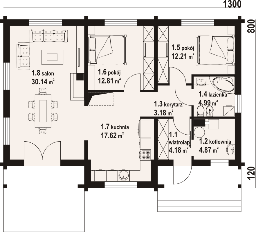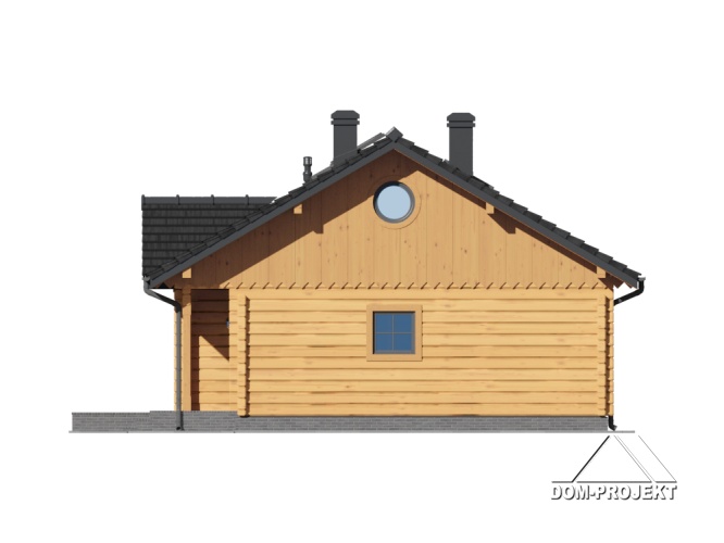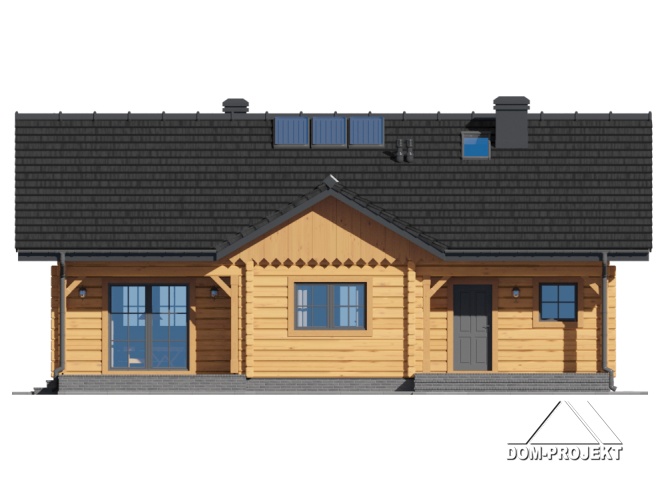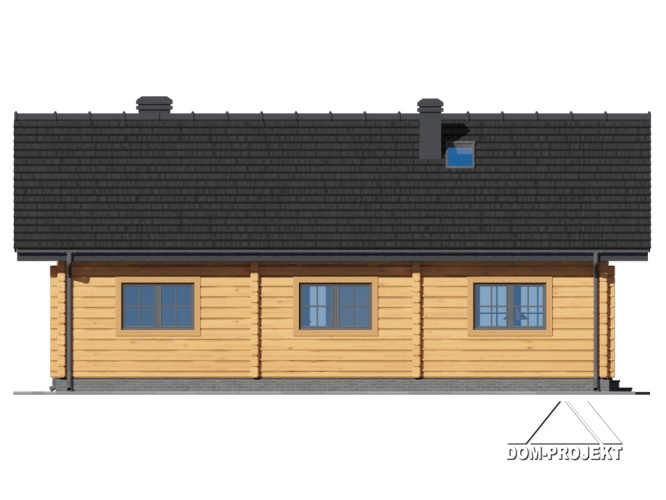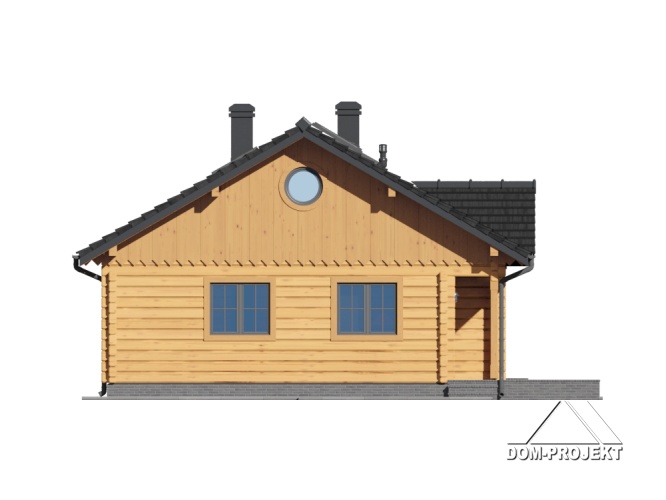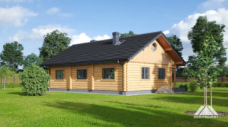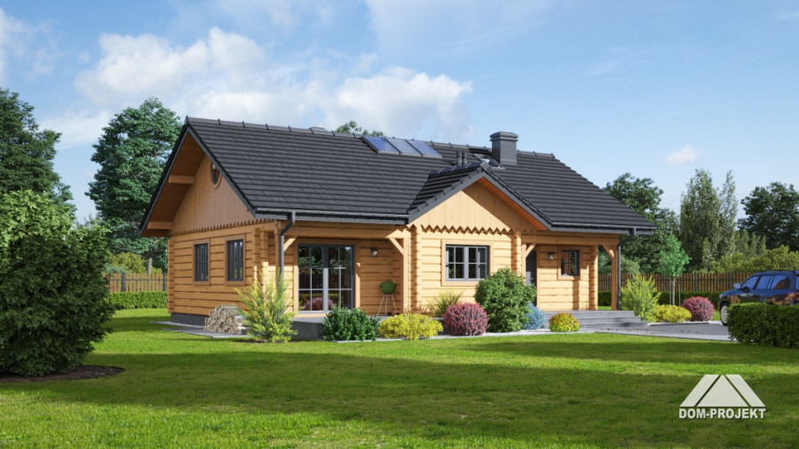Dom parterowy z bali. Duży salon z aneksem kuchennym, kominkiem i wyjściem na taras. Dwa pokoje, łazienka, kotłownia, korytarz i wiatrołap. Wyjście na poddasze schodami strychowymi rozkładanymi. Instalacja solarna.