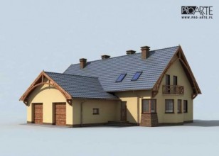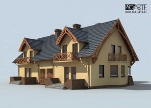 To projekt domu bliźniaczego, niepodpiwniczonego, z możliwością przerobienia kotłowni na węgiel. Bardzo okazale prezentuje się w tym wypadku elewacja tylna domu, ponieważ na poddaszu przewidziano miejsce na balkon, a na parterze – wyjście na taras. Elewacje boczne charakteryzuje ciekawe rozwiązanie architektoniczne, gdyż nad zbudowanym na planie trapezu wykuszem, jest kolejny balkon. Od frontu segmenty domu są od siebie oddzielone jednostanowiskowymi garażami, przewidzianymi dla obu mieszkających tutaj rodzin. Takie ustawienie garaży, może okazać się bardzo praktyczne, gdy zdecydujemy się wybudować ten dom blisko granicy działki – wtedy wybrukowanie dojazdu, będzie znacznie tańsze, niż w przypadku innych p
