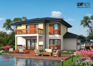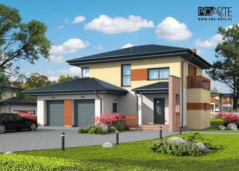 Brunei - dom mieszkalny Ten projekt dedykowany jest miłośnikom funkcjonalnych i nowoczesnych rozwiązań z wyobraźnią. W Brunei forma architektoniczna wynika z funkcji domu. To dom ma służyć swoim domownikom, a nie oni domowi. Bryła budynku upiększona gustownym odeskowaniem oraz pięknie wpisanymi balkonami to prawdziwy majstersztyk. Proste płaszczyzny elewacji, balkony i prostokątne otwory okienne wspaniale uplastyczniają bryłę budynku. W Brunei wszystko tworzy harmonijną i zrównoważoną całość, którą dopełnia dwustanowiskowy garaż. Zgodnie z tym, co widzimy na wizualizacji warto pójść za sugestią i zainwestować w przydomowy basen - takie zestawienie prezentuje się imponująco. Wytworzony w ten sposób wakacyjny klimat zgodnie współgra z nowoczesnym wyglądem domu. Weranda prowa