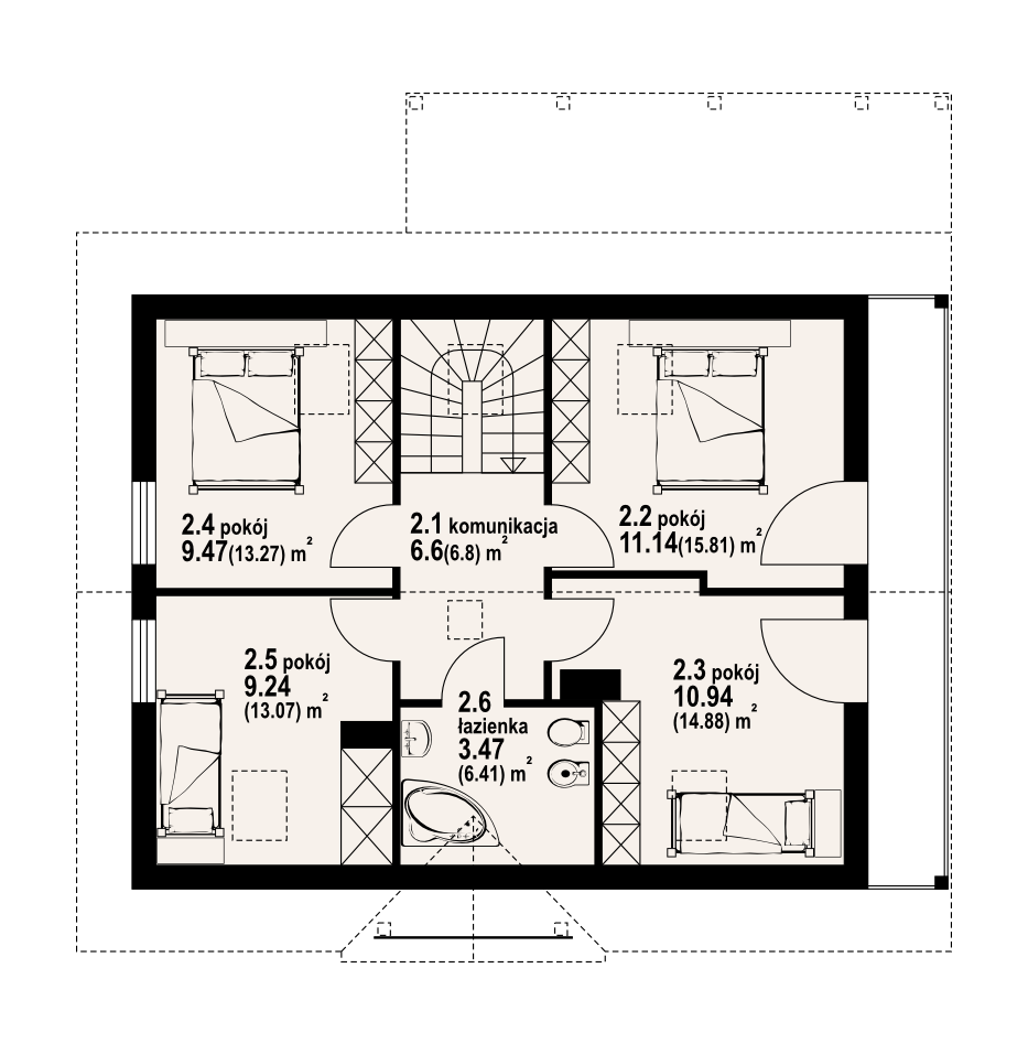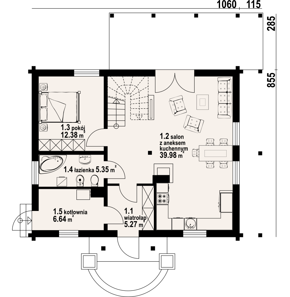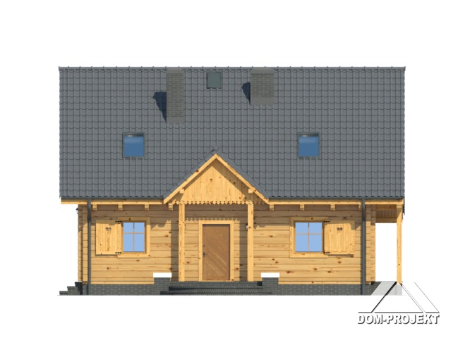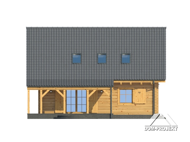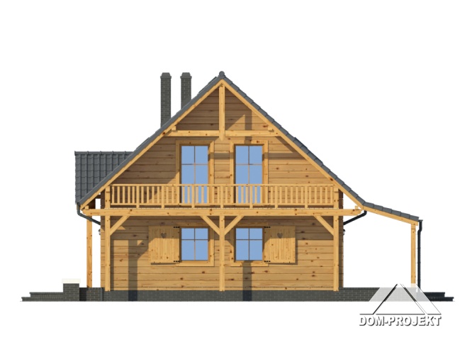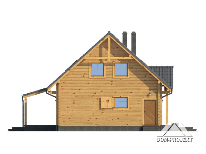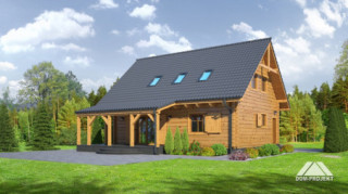Dom z bali drewnianych. Duży salon z aneksem kuchennym, kominkiem, schodami na poddasze i wyjściem na taras. Pokój, łazienka, wiatrołap i kotłownia. Na poddaszu cztery pokoje, łazienka i komunikacja. Balkon. Zwarta bryła budynku i dach dwuspadowy sprzyjają szybkiej i taniej budowie i niskim kosztom eksploatacji.
