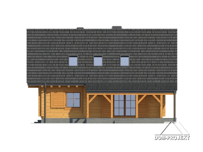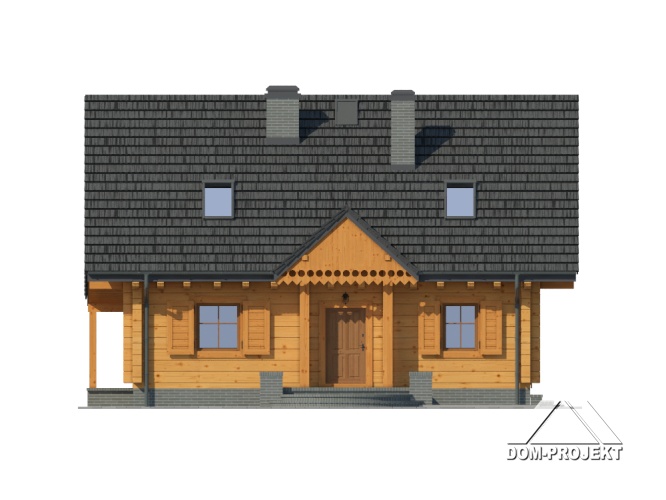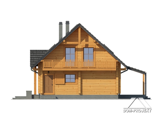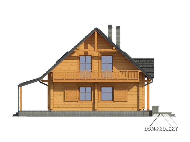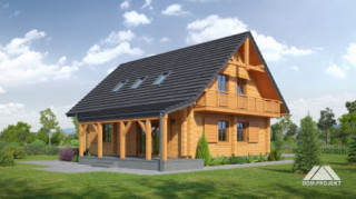 Dom z bali drewnianych. Duży salon z aneksem kuchennym, kominkiem wyjściem na taras i schodami na poddasze. Pokój, łazienka, kotłownia i wiatrołap. Na poddaszu cztery pokoje, łazienka, komunikacja i dwa balkony. Prosta bryła budynku i dach dwuspadowy sprzyjają szybkiej i taniej budowie i niskim kosztom eksploatacji.