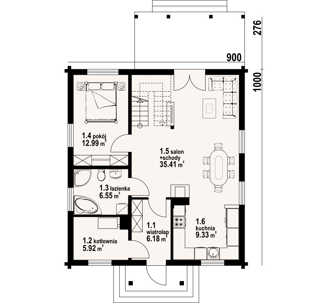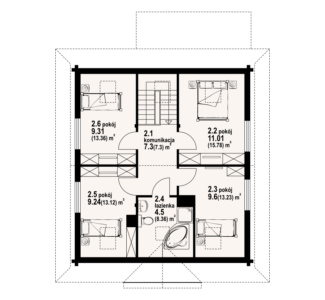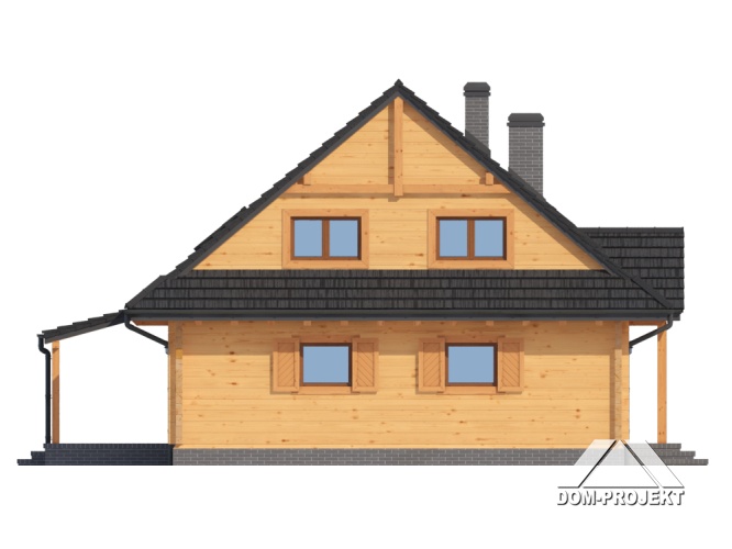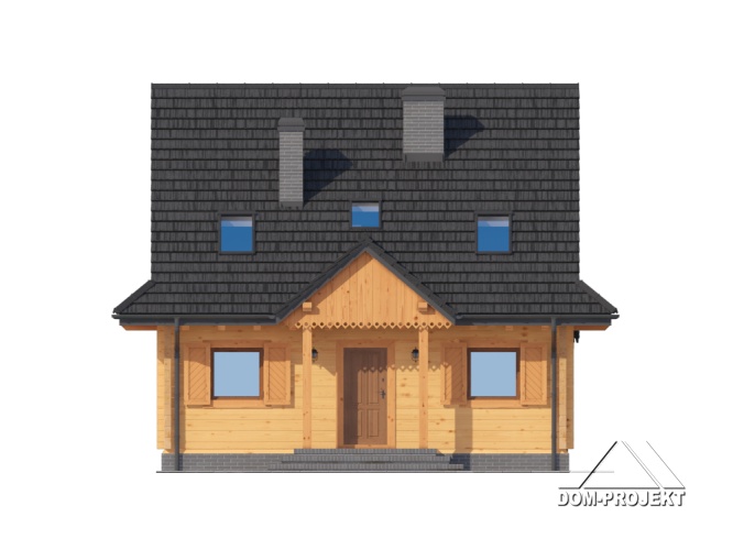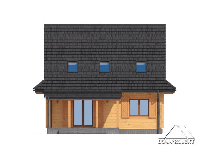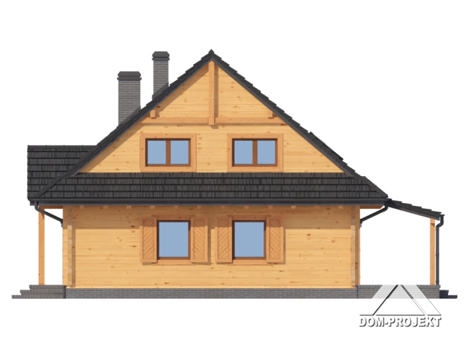Dom z bali drewnianych. Duży salon z aneksem kuchennym, kominkiem, schodami na poddasze i wyjściem na zadaszony taras. Pokój, łazienka, kotłownia, wiatrołap. Na poddaszu cztery pokoje, łazienka i komunikacja. Zwarta bryła budynku i dach dwuspadowy sprzyjają szybkiej i taniej budowie i niskim kosztom eksploatacji.