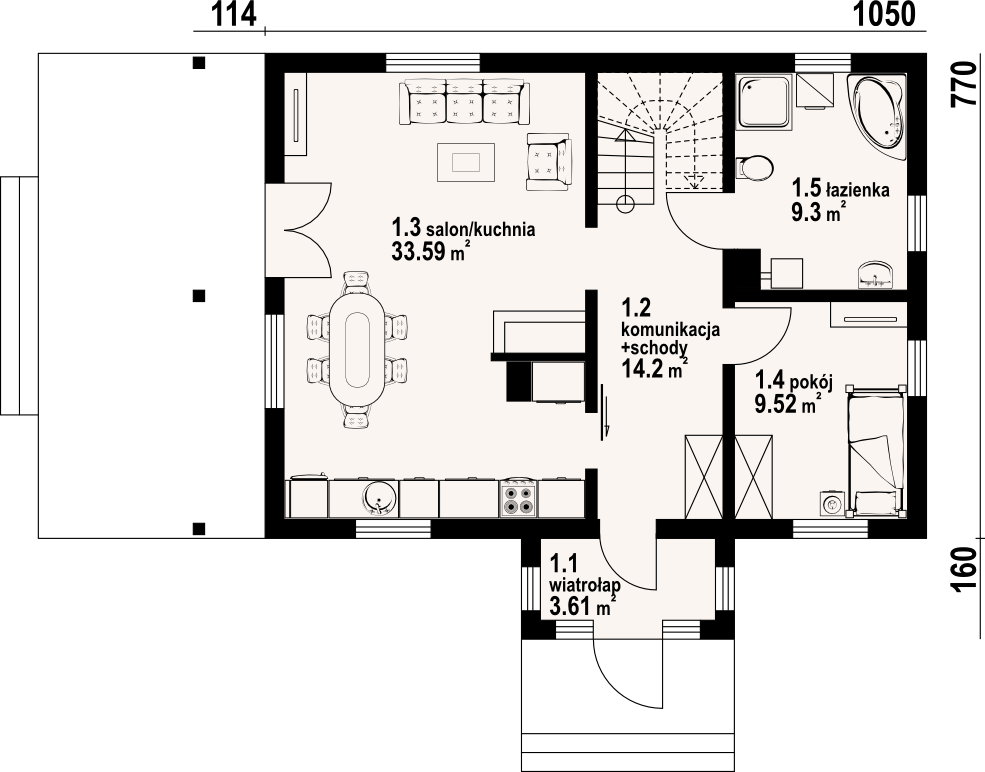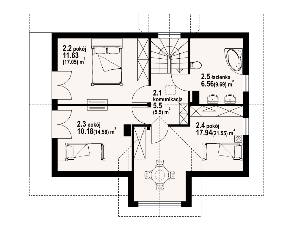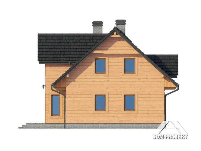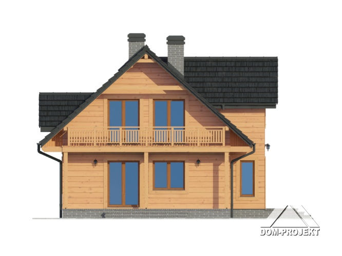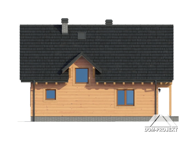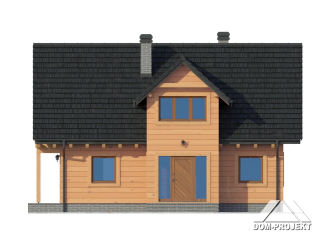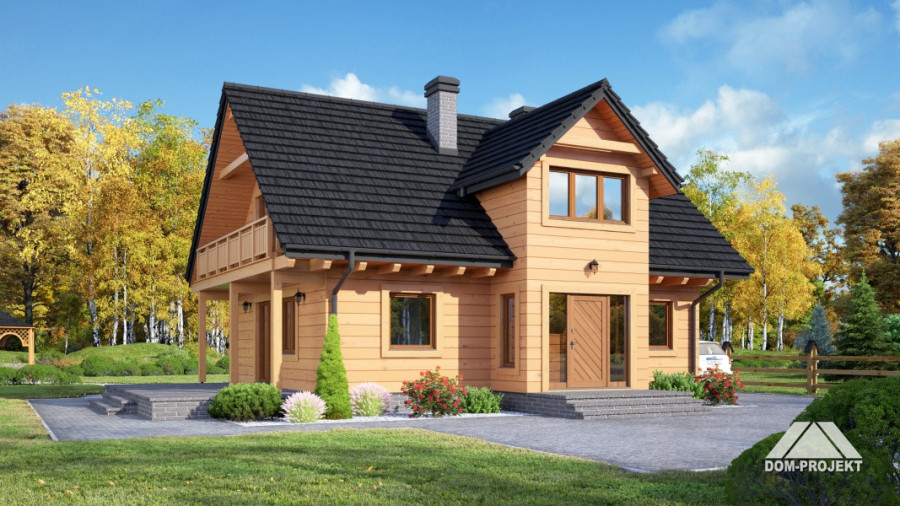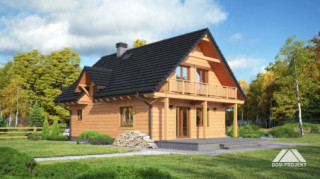 Dom w konstrukcji szkieletu drewnianego. Duży salon a aneksem kuchennym, kominkiem i wyjściem na taras. Pokój, łazienka, komunikacja i wiatrołap. Na poddaszu trzy pokoje, łazienka, komunikacja i balkon. Zwarte bryła budynku i dach dwuspadowy sprzyjają taniej i szybkiej budowie i niskim kosztom eksploatacji.