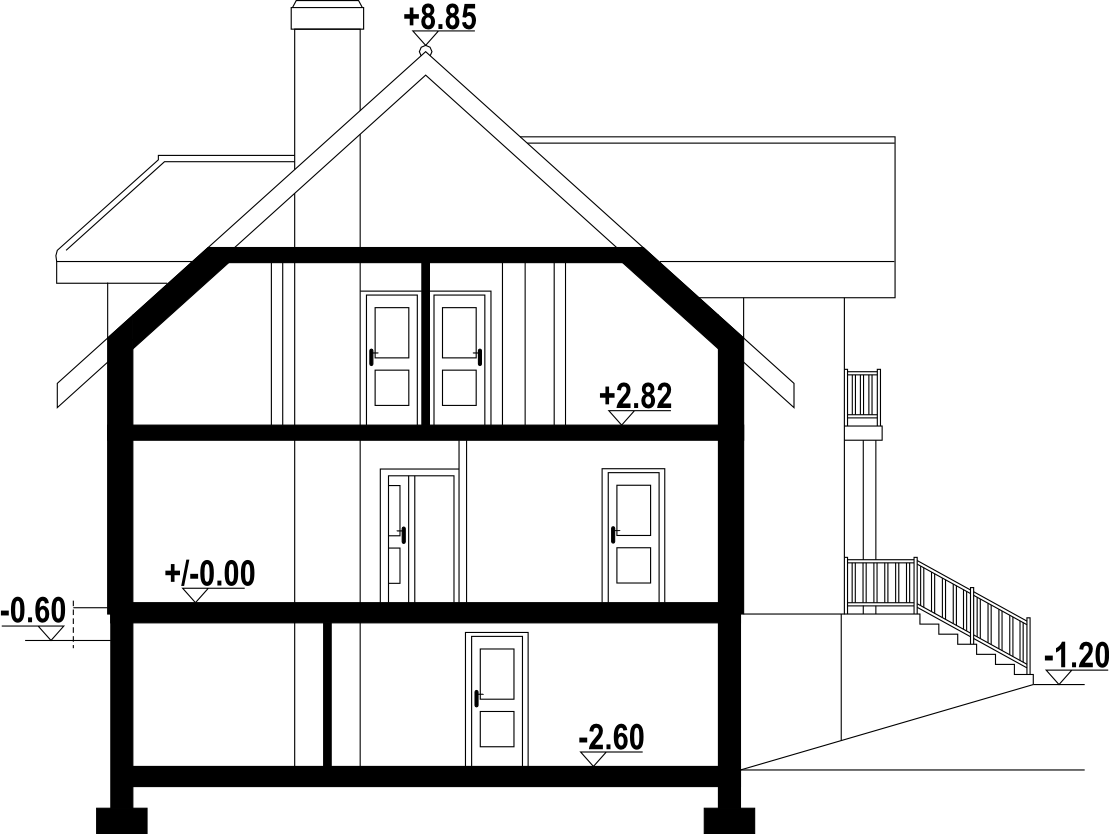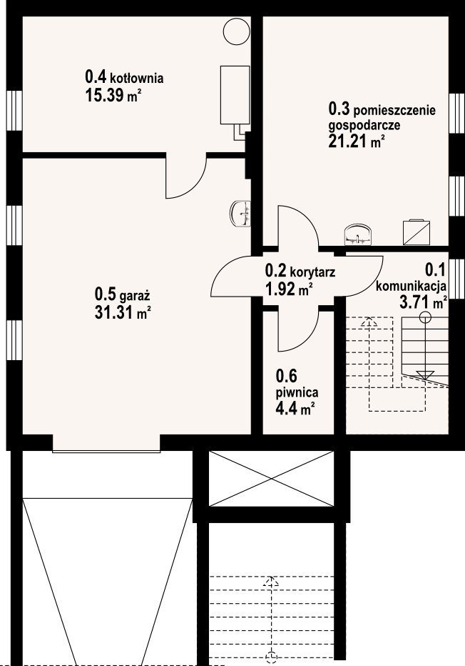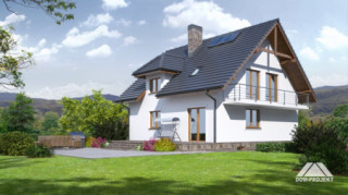 Dom z poddaszem użytkowym i całkowitym podpiwniczeniem. W piwnicach garaż i zaplecze gospodarcze. Na parterze salon z kominkiem, pokój, wydzielona kuchnia ze spiżarką. Ponadto łazienka i pom. gospodarcze. Na poddaszu cztery sypialnie, w tym trzy z wyjściem na balkon, oraz łazienka.