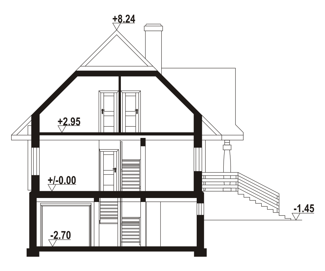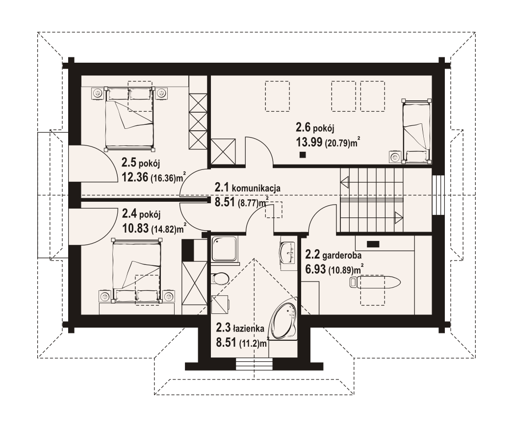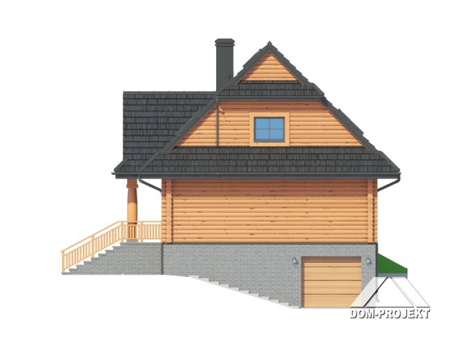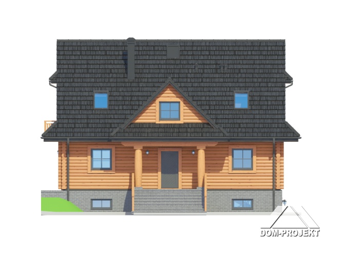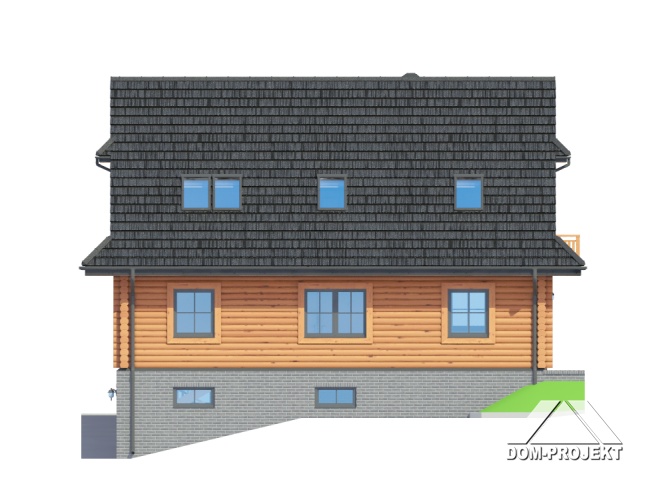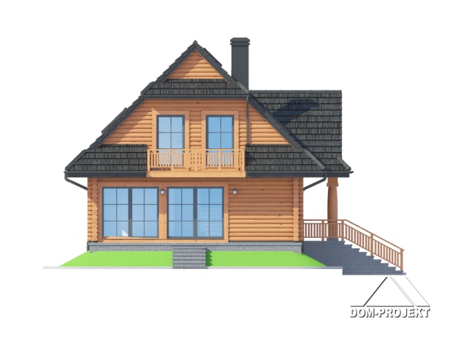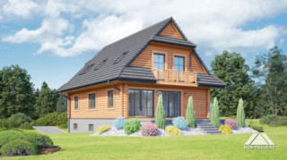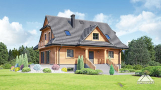Dom z bali drewnianych. Podpiwniczony. Duży salon z aneksem kuchennym, kominkiem i wyjściami na taras. Pokój, łazienka, komunikacja, wiatrołap, kotłownia. Na poddaszu trzy pokoje, łazienka, garderoba, komunikacja i balkon. Zwarta bryła budynku i dach dwuspadowy sprzyjają szybkiej i taniej budowie i niskim kosztom eksploatacji.
