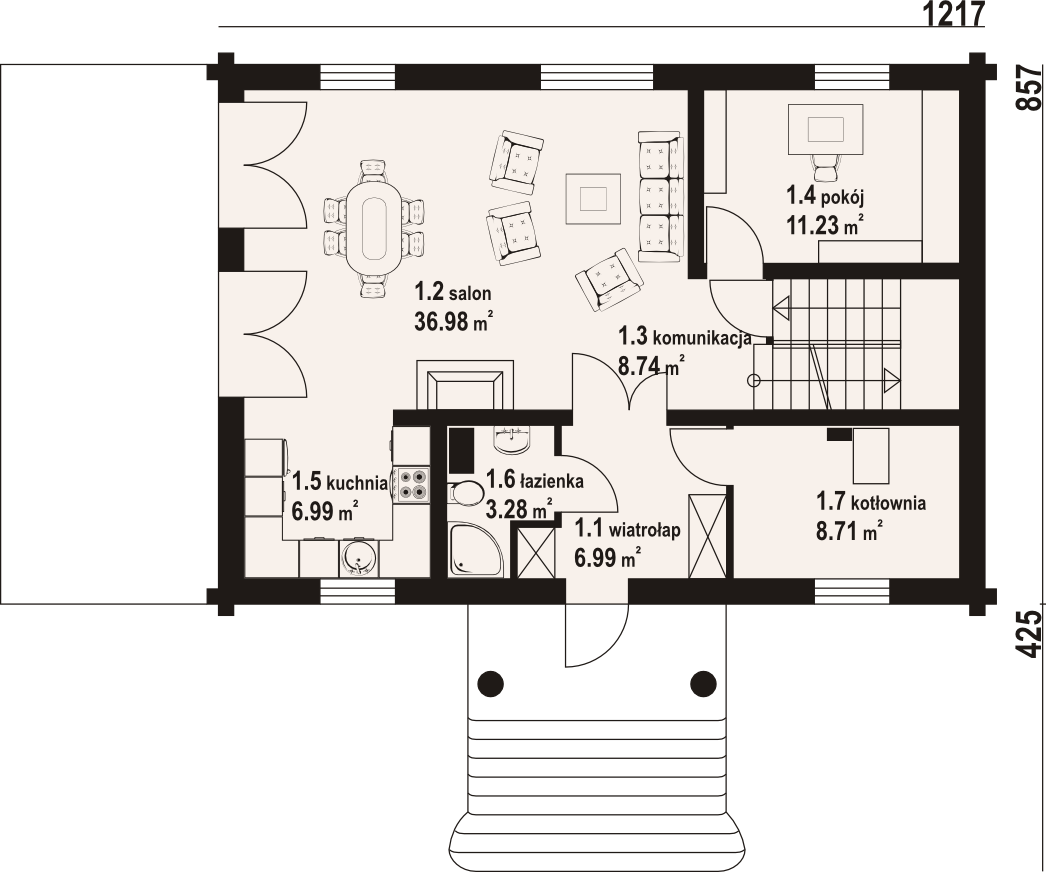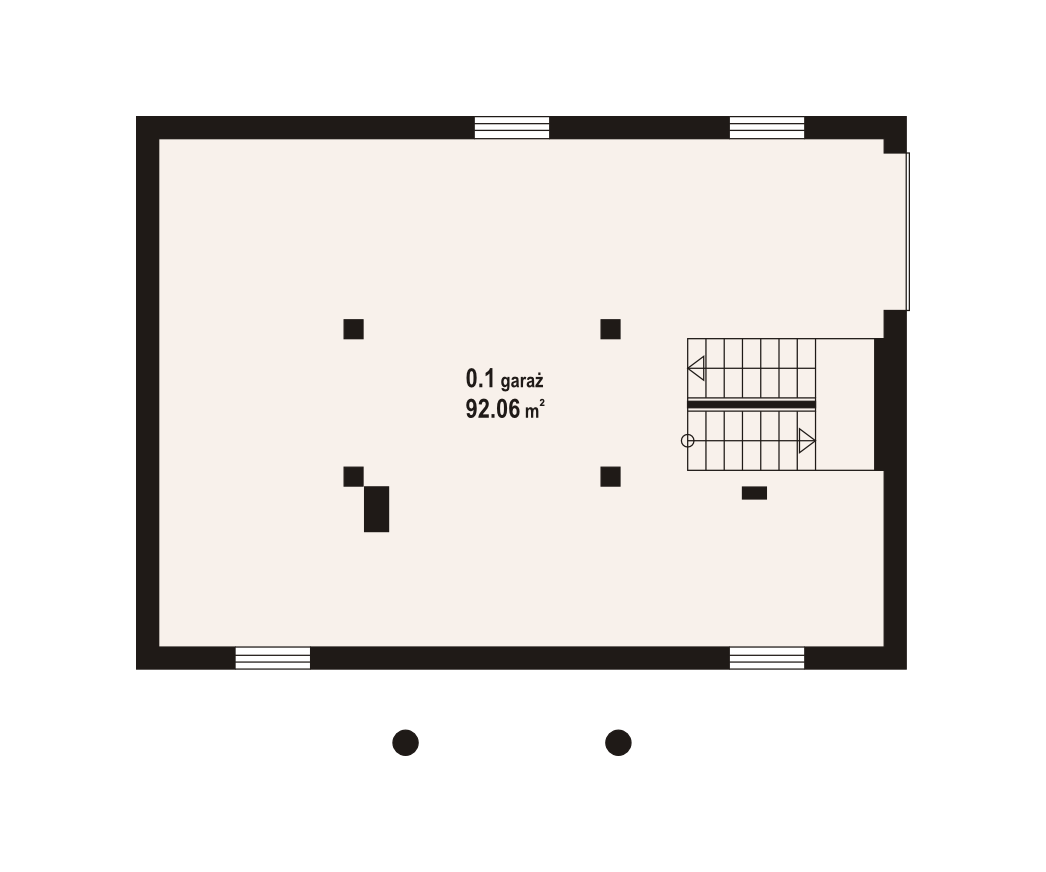 Powierzchnia zabudowy konieczna do zrealizowania projektu to 121,72 m2. Inwestorzy do dyspozycji otrzymują trzy kondygnacje. Piwnicę przeznaczono w całości na przestronny garaż, dwa pozostałe poziomy przystosowano do potrzeb domowników, tworząc wnętrza mieszkalne. Na parterze dominuje pokój dzienny z efektownym kominkiem, na który przeznaczono aż 36,98 m2. Aneks kuchenny ulokowano we wnęcę, a w sąsiedztwie salonu wydzie