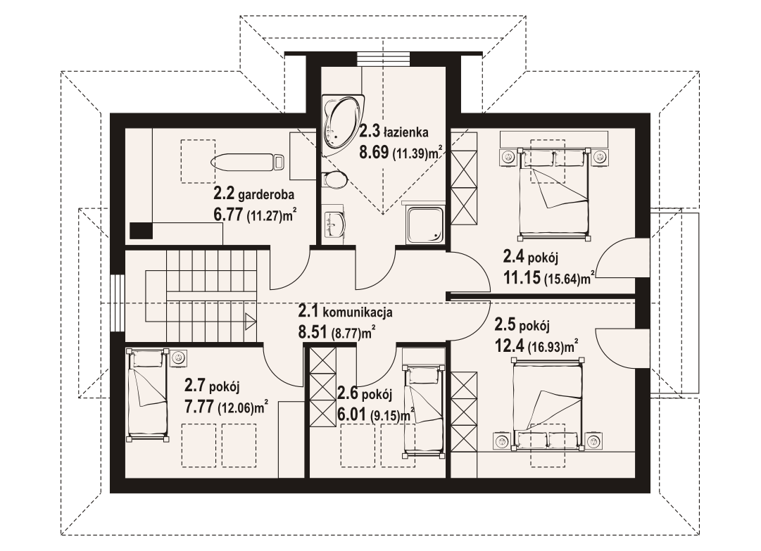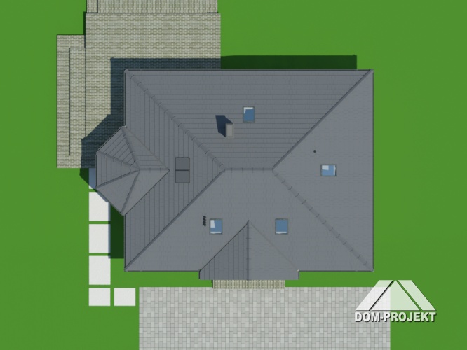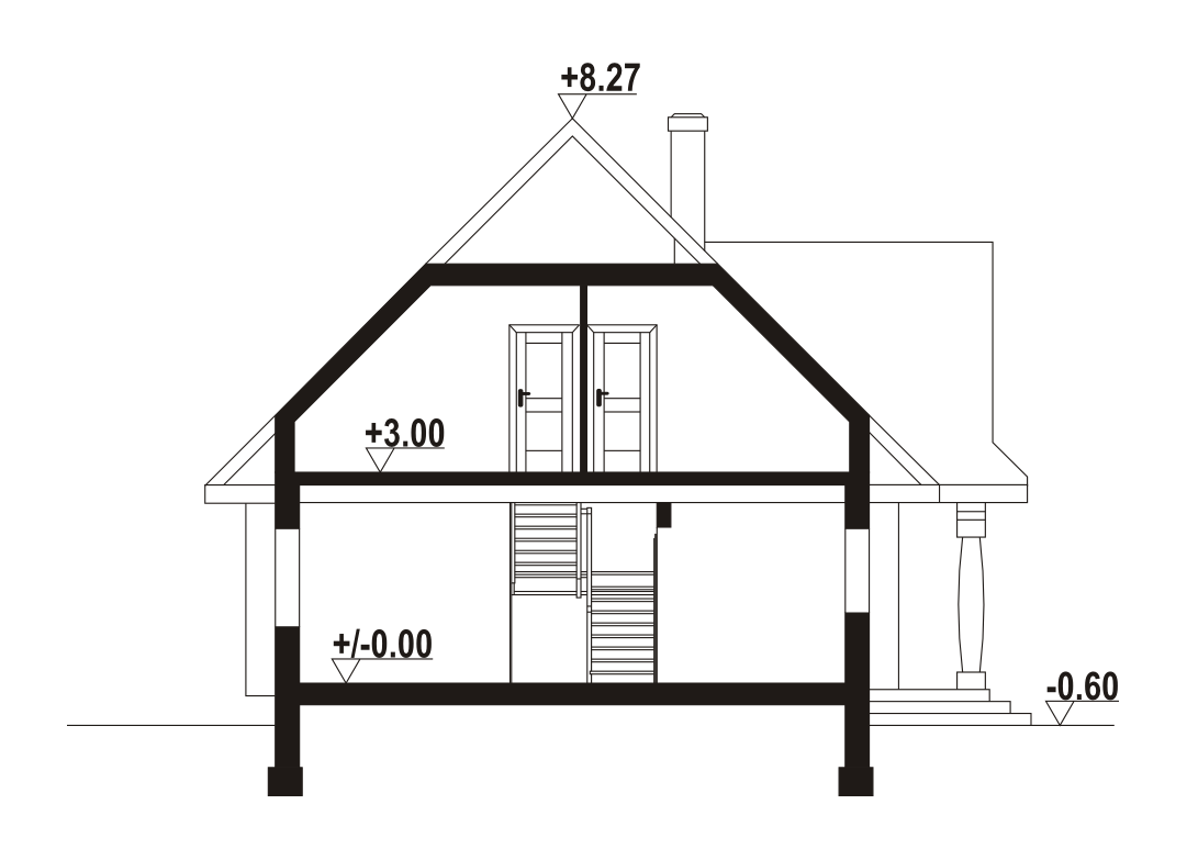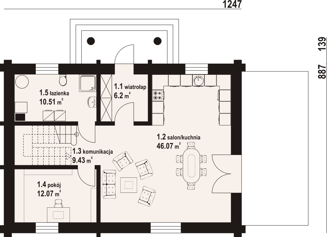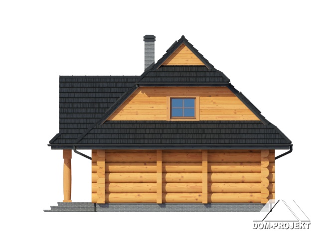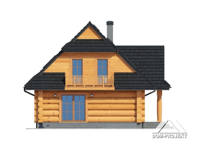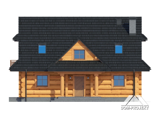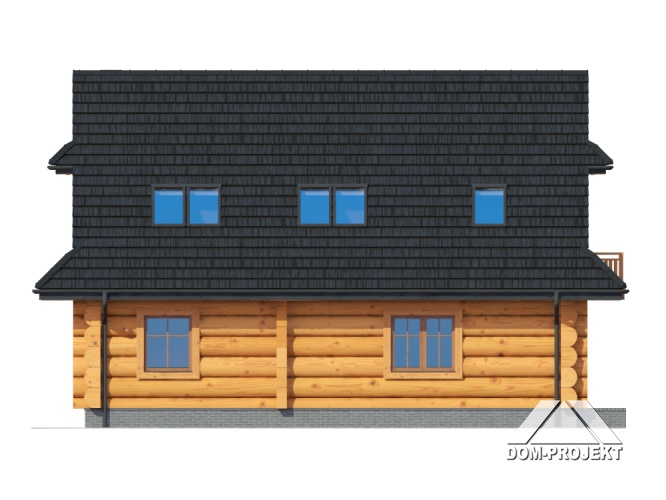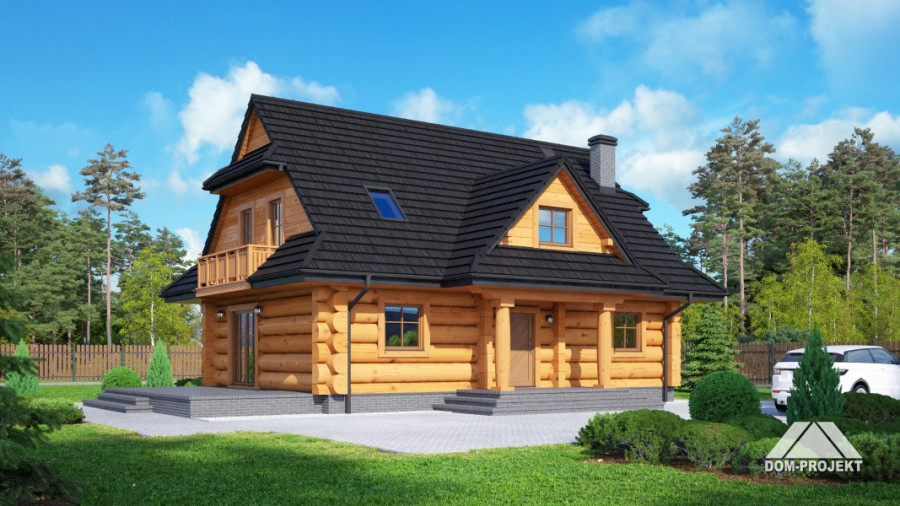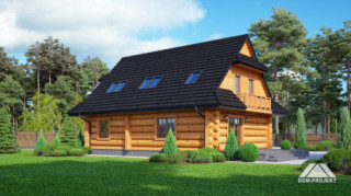 Dom z bali drewnianych. Duży salon z aneksem kuchennym i wyjściem na taras. Pokój, łazienka, wiatrołap i komunikacja. Na poddaszu cztery pokoje, łazienka, garderoba i komunikacja. Zwarta bryła budynku i dach dwuspadowy sprzyjają szybkiej i taniej budowie i niskim kosztom eksploatacji.