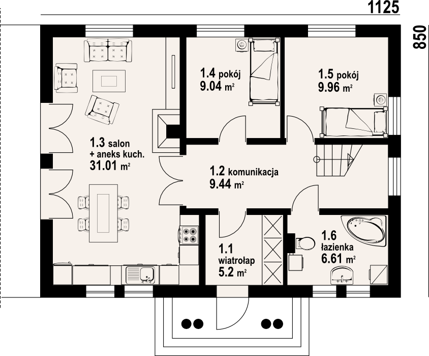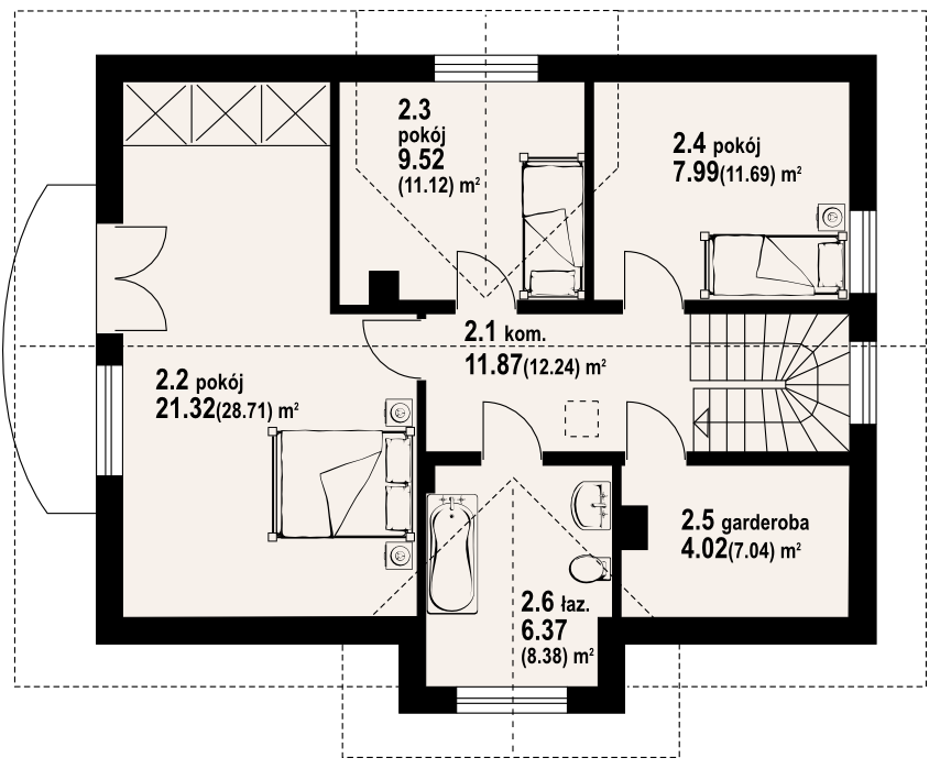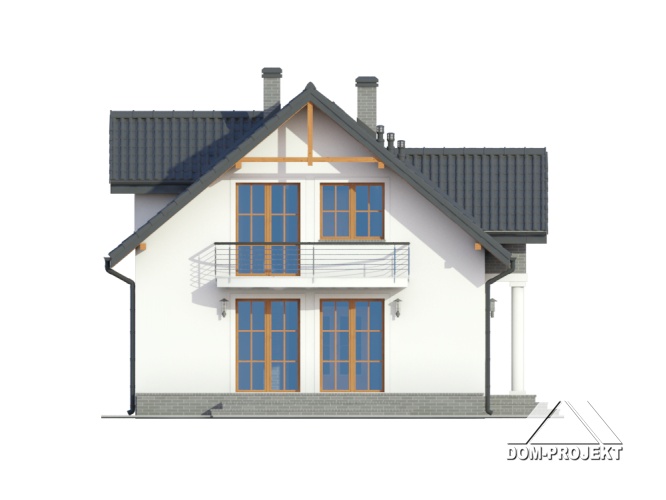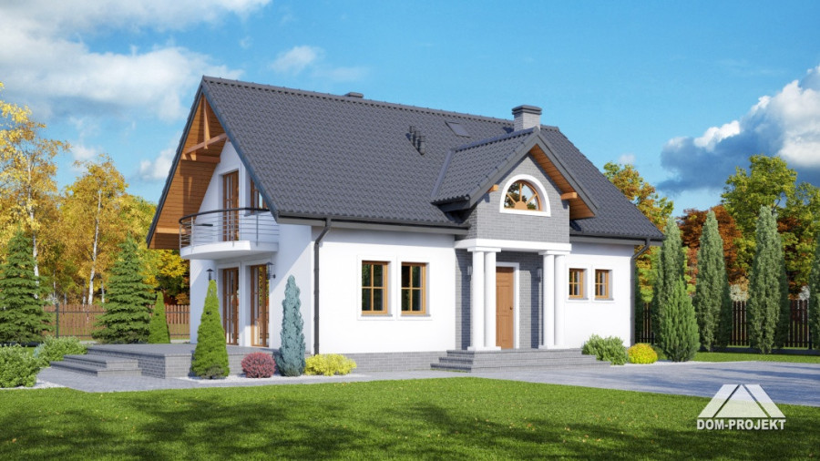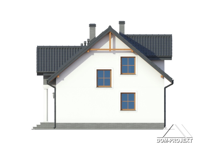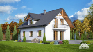 Dom z poddaszem użytkowym. Na niewielkiej powierzchni zabudowy bogata funkcja pomieszczeń. Salon i dwa pokoje na parterze, trzy sypialnie na poddaszu.