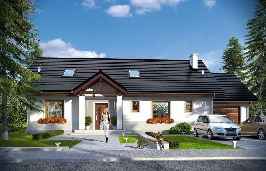 Projekt domu Anatol 2 to kolejna odsłona popularnego projektu domu jednorodzinnego Anatol. Jest to parterowy domek, przeznaczony do zamieszkania dla 4- 6-osobowej rodziny. Dzięki dużemu strychowi, który można zaadaptować na poddasze użytkowe, dom doskonale sprawdzi się dla rozwojowej, rosnącej rodziny, której potrzeby mogą się zwiększać. Dzięki strychowi do adaptacji w łatwy sposób można uzyskać dodatkową powierzchnię mieszkalną. Architektonicznie dom jest prostą ponadczasową bryłą, zbudowaną na planie prostokąta, przekrytą dwuspadowymi dachami. Dobrze dobrane proporcje elewacji, oraz nowoczesne materiały wykończeniowe, dają domowi atrakcyjny i przyjemny dla oka wygląd. Funkcjonalne wnętrze, mieszczące wszystkie pomieszczenia mieszkalne i techniczne na parterze, dopełnia atrakcyjności domu. Na parterze zmieszczono część dzienną z salonem, kuchnią i holem, oraz sypialnie domowników - trzy sypialnie i dodatkowy pokój do pracy. Prócz tego w domu zmieściły się łazienki, garderoba, spiżarnia i kotłownia, oraz garaż. Na strych dostajemy się schodkami z kotłowni. Strych można dowolnie zagospodarować - urządzić tam dodatkowe 2-3 pokoje, lub jednoprzestrzenną powierzchnię. Dom ma prostą konstrukcję, jest łatwy w budowie. Dzięki temu koszty realizacji nie powinny być wygórowane. Dzięki zwartej bryle i dobrym izolacjom dom jest ciepły i energooszczędny. Koszty utrzymania Anatola 2 nie będą wysokie. Zapraszamy do zapoznania się z pełną ofertą pracowni MG Projekt: projekt domu Anatol.