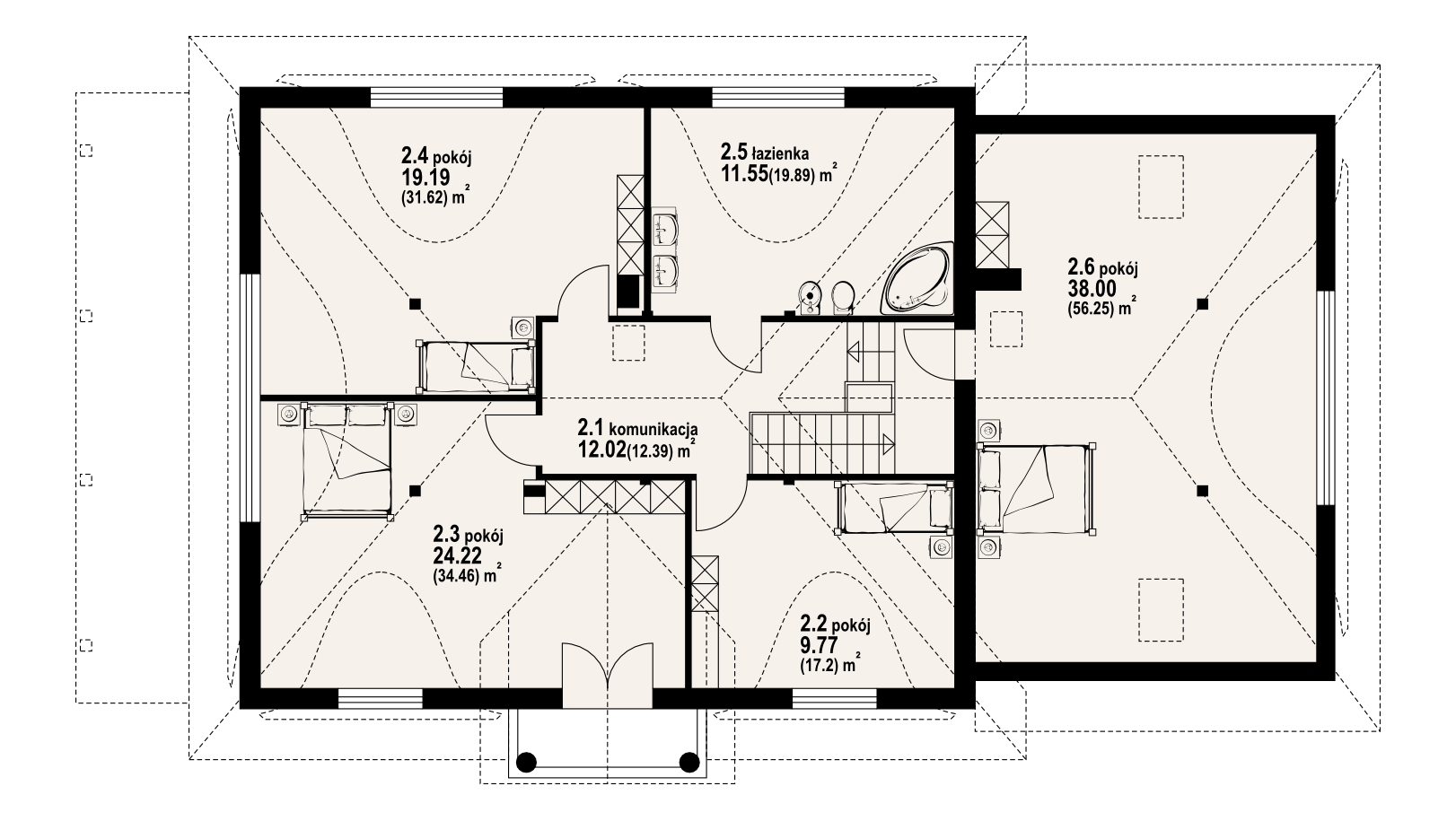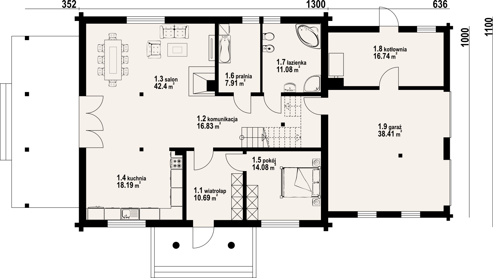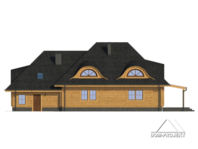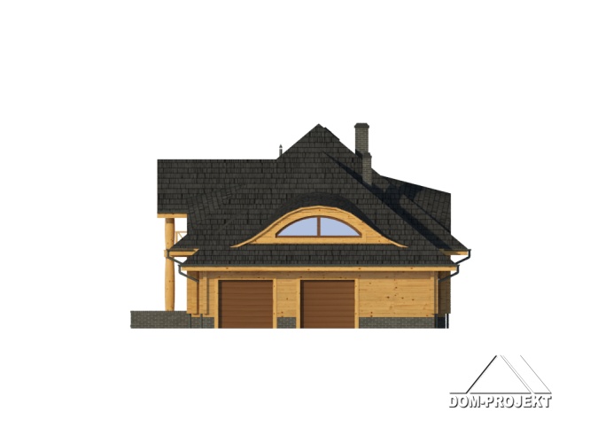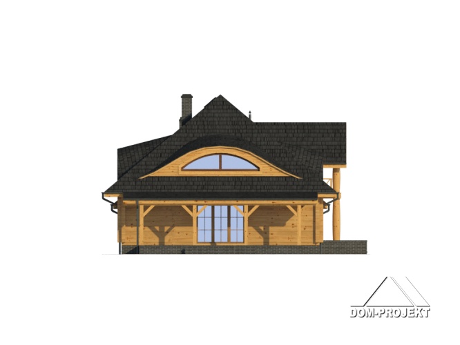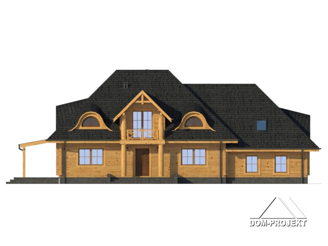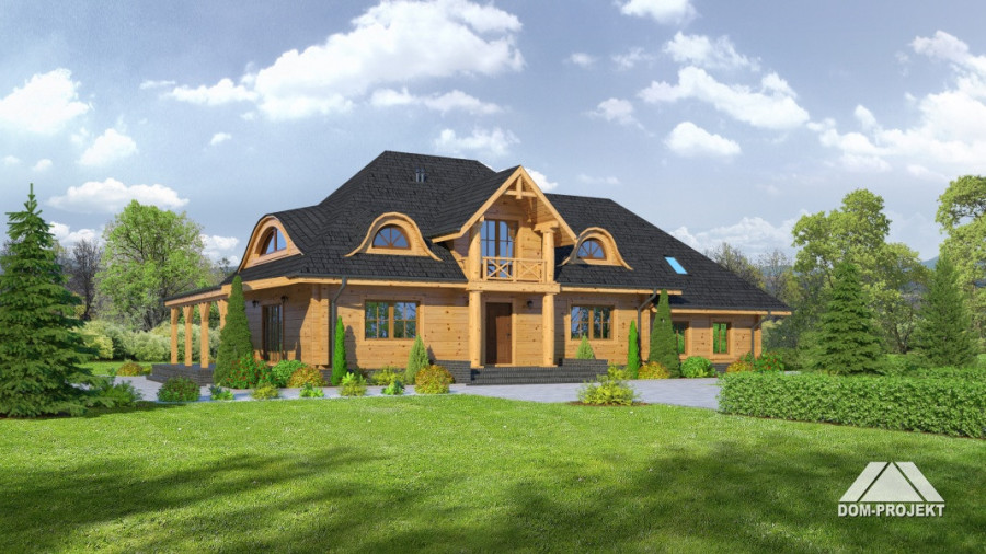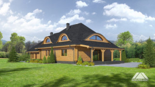 Dom z bali drewnianych. Duży salon z aneksem kuchennym, kominkiem i wyjściem na zadaszony taras. Pokój, łazienka, pralnia, wiatrołap, komunikacja, garaż i kotłownia. Na poddaszu cztery pokoje, łazienka i komunikacja. Jeden pokój ma balkon.