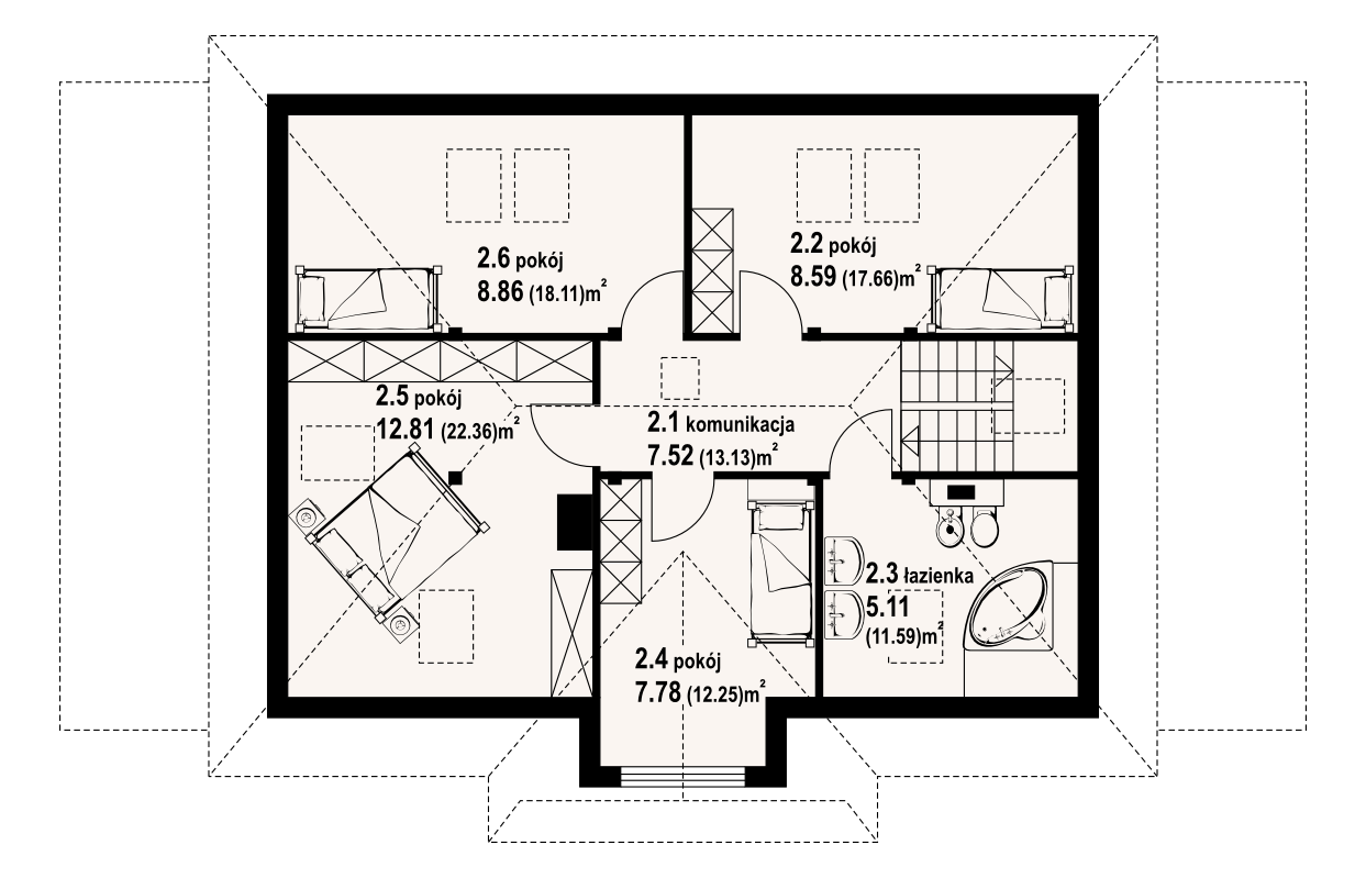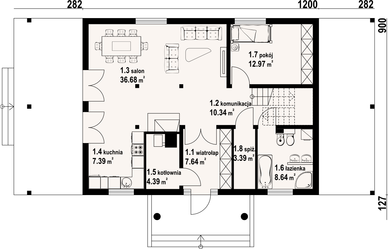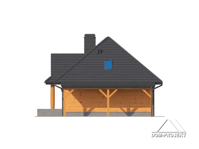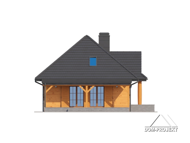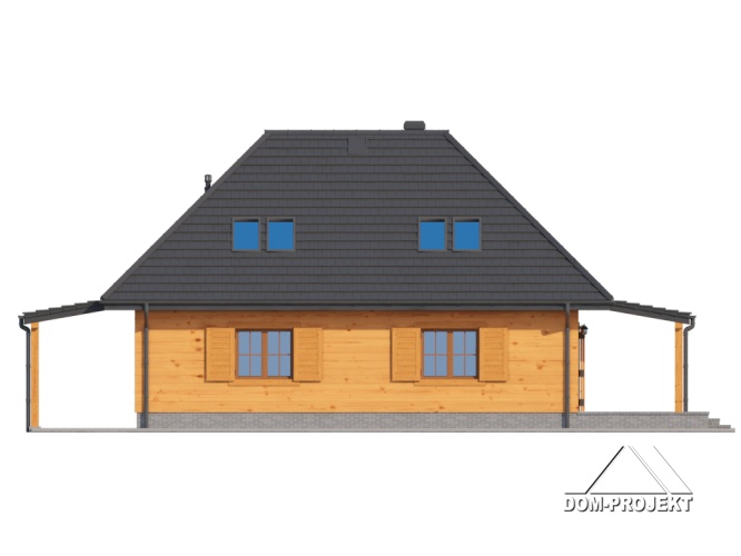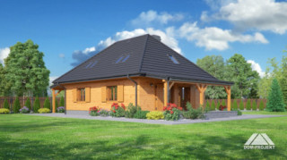 Dom w konstrukcji szkieletu drewnianego. Duży salon z aneksem kuchennym, kominkiem, wyjściami na duży zadaszony taras. Pokój, łazienka, spiżarka, wiatrołap i wiata garażowa. Na poddaszu cztery pokoje, łazienka i komunikacja. Liczne warianty projektu.
