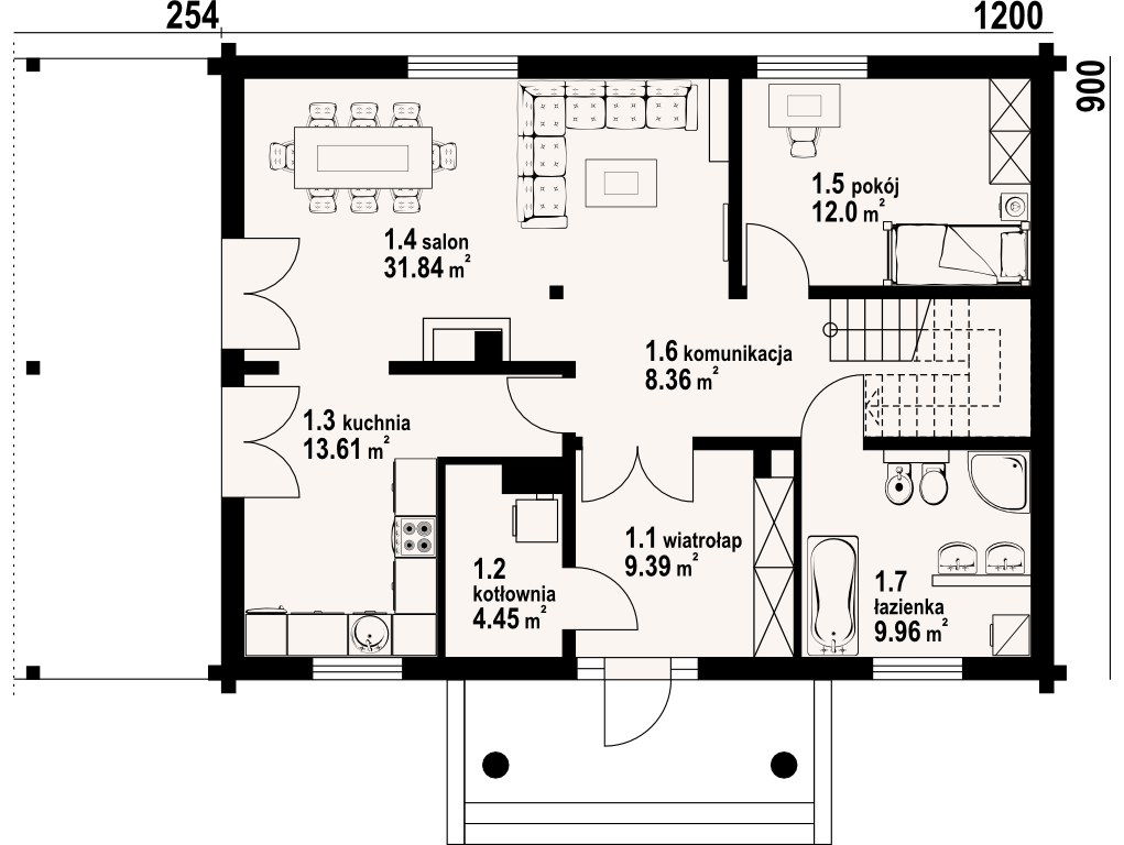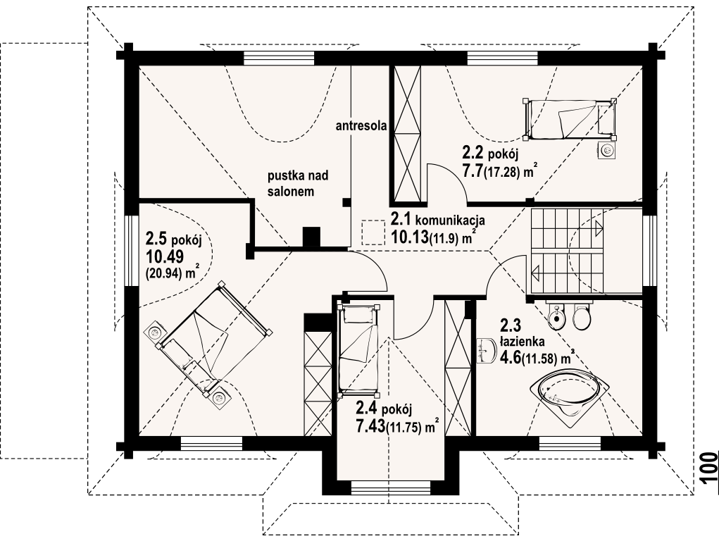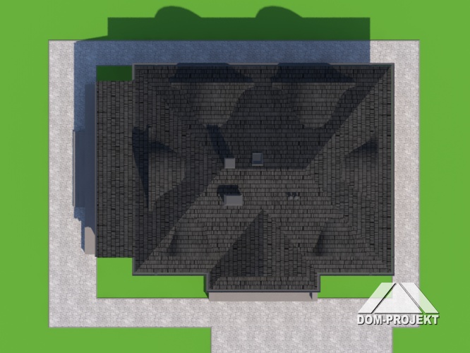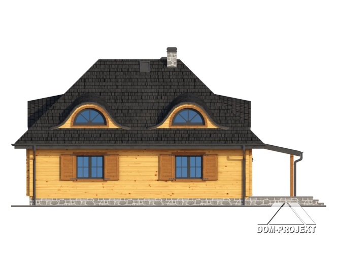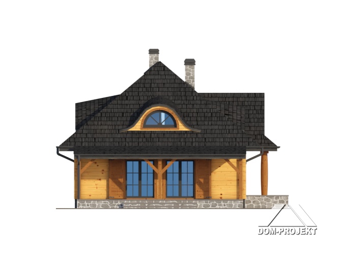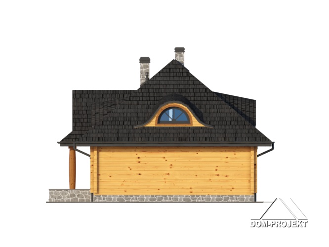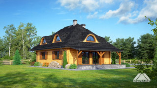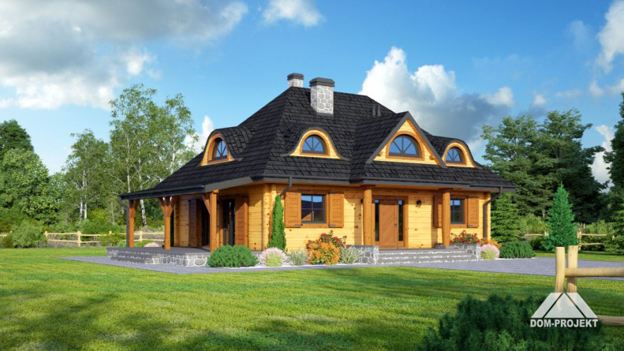 Dom z bali drewnianych. Architektura budynku nawiązuje do tradycji polskiego dworu drewnianego. Duży salon z aneksem kuchennym, kominkiem i wyjściem na zadaszony taras. Pokój, łazienka, wiatrołap, komunikacja, kotłownia. Na poddaszu trzy pokoje, antresola i pustka nad częścią salonu, łazienka i komunikacja.
