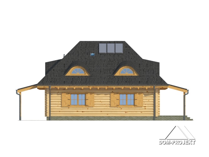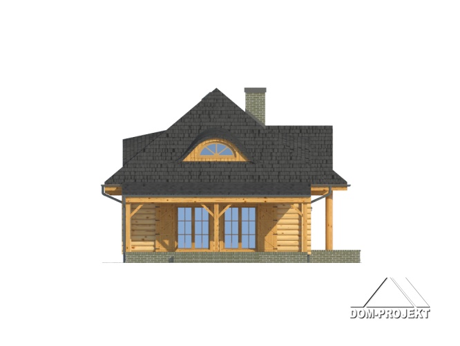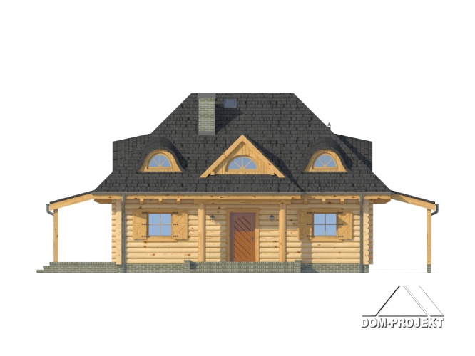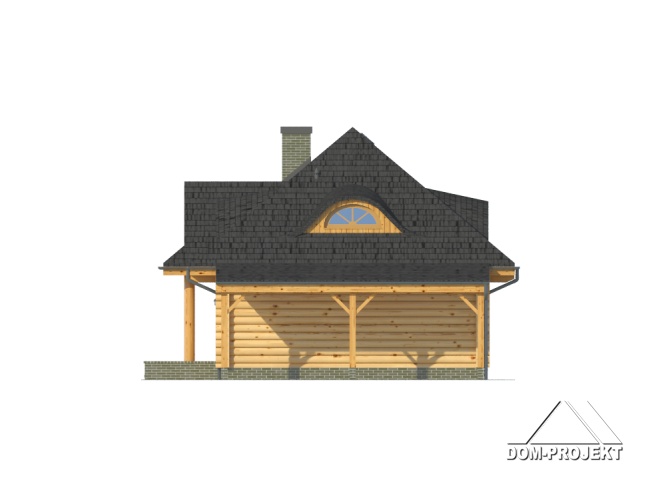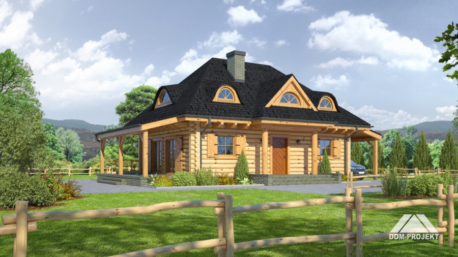 Dom z bali drewnianych o ciekawej architekturze. 4 pokoje, 2 łazienki, spiżarka, pralnia, wc. Duży salon z aneksem kuchennym, kominkiem i wyjściem na taras. Nad częścią salonu antresola. Na parterze funkcje dzienne, na poddaszu funkcje nocne. Zadaszony duży taras i zadaszona wiata garażowa.