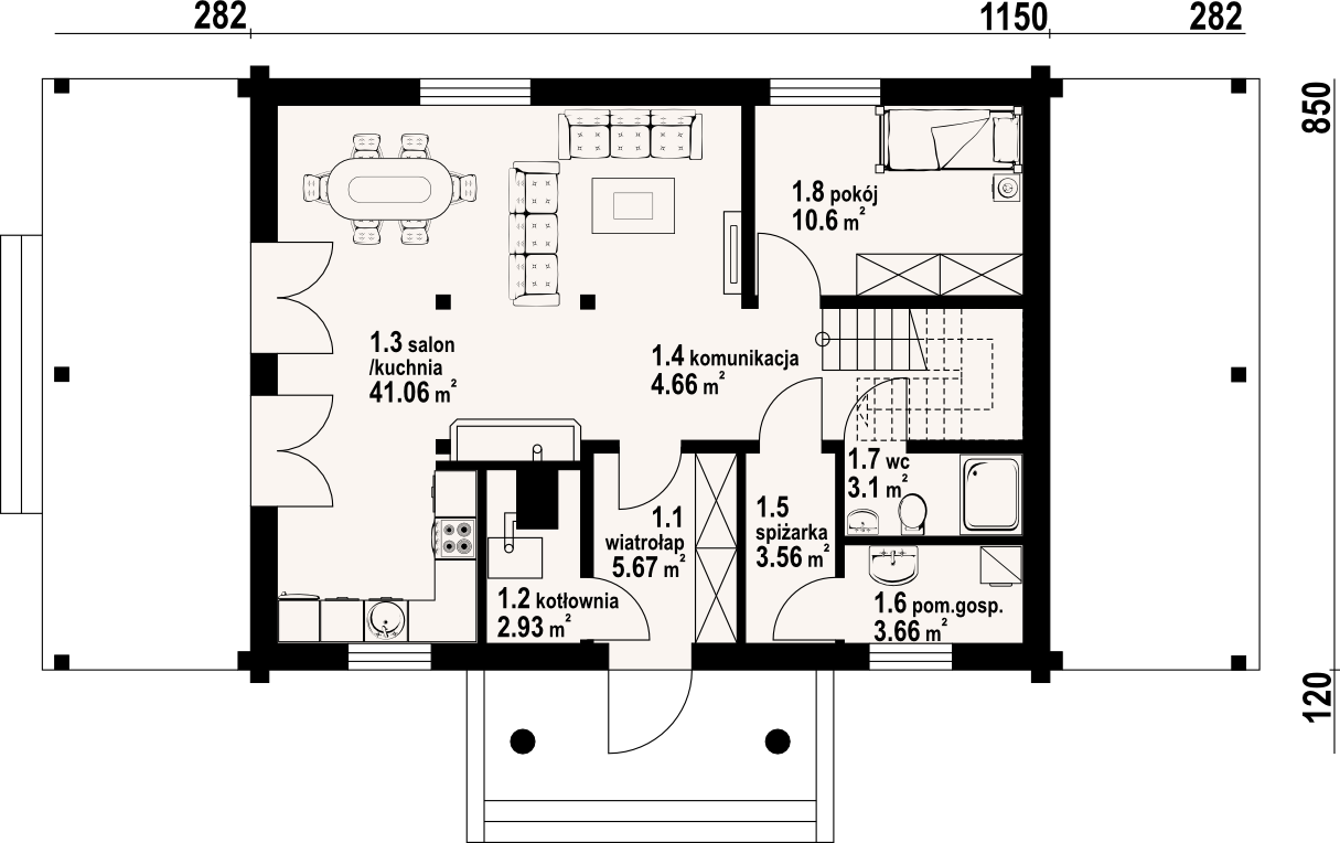 Dom z bali drewnianych o ciekawej architekturze. cztery pokoje, dwie łazienki, spiżarka, pralnia, wc. Duży salon z aneksem kuchennym, kominkiem i wyjściem na taras. Nad częścią salonu antresola. Na parterze funkcje dzienne, na poddaszu funkcje nocne. Zadaszony duży taras i zadaszona wiata garażowa.