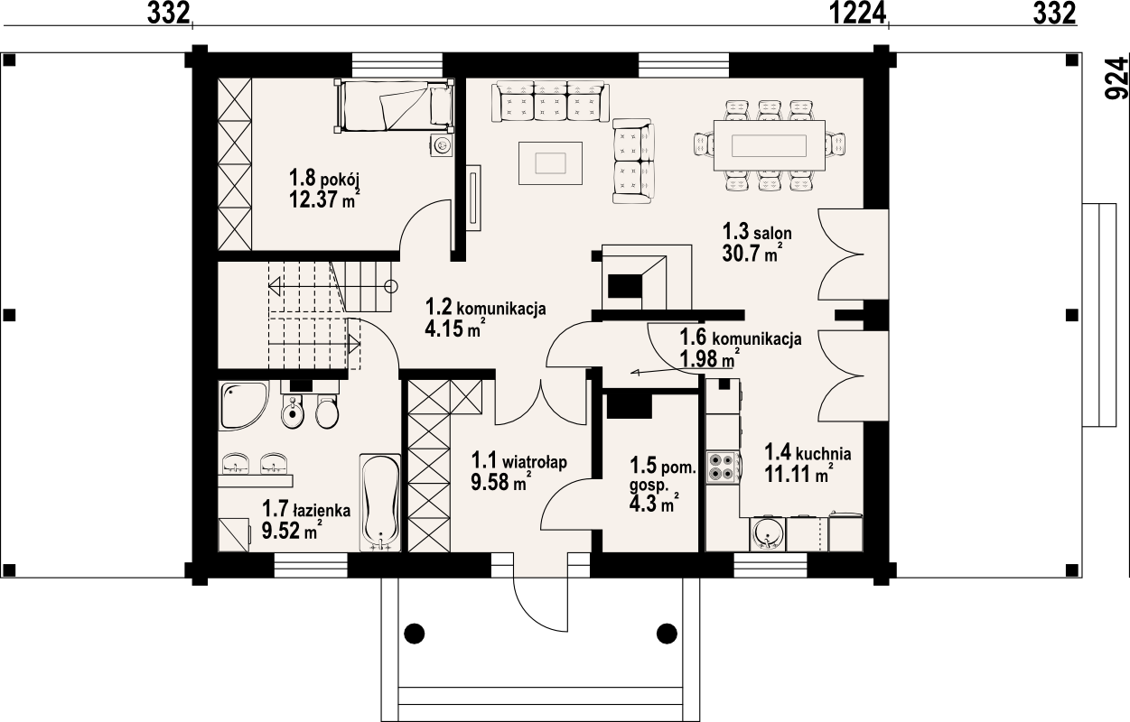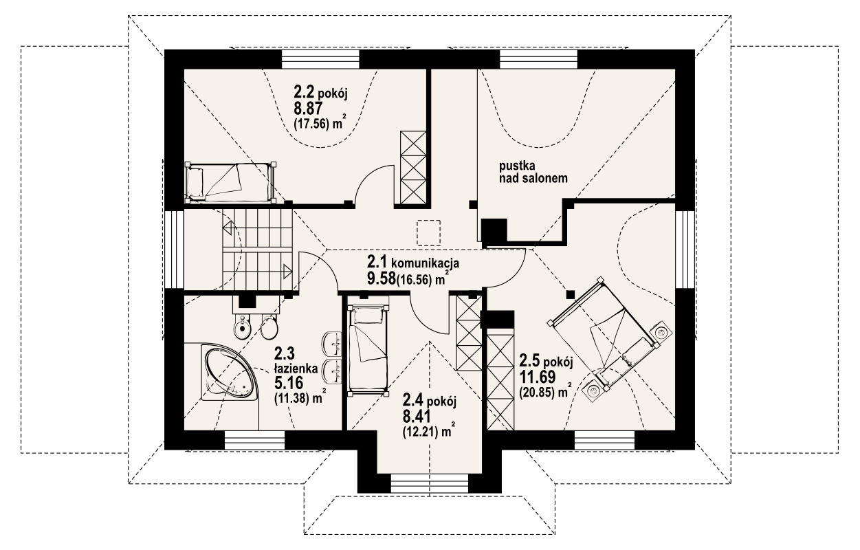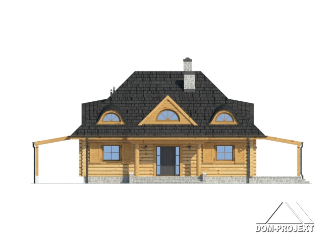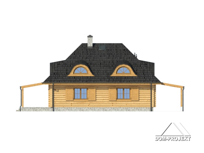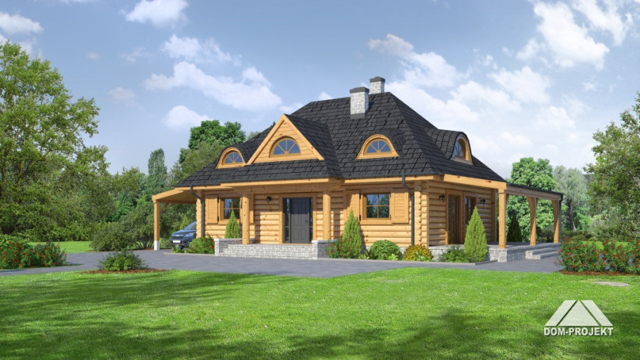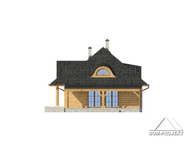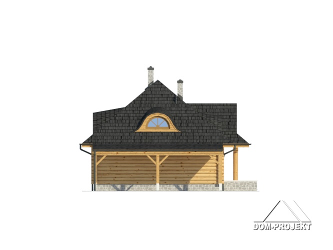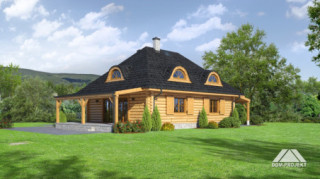 Dom drewniany z bali. .Duży salon z aneksem kuchennym, kominkiem i wyjściem na taras. Pokój, łazienka, wiatrołap z miejscem na szafy, pomieszczenie gospodarcze i schody na poddasze. Na poddaszu trzy pokoje, łazienka, komunikacja, antresola i pusta przestrzeń nad częścią salonu.
