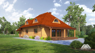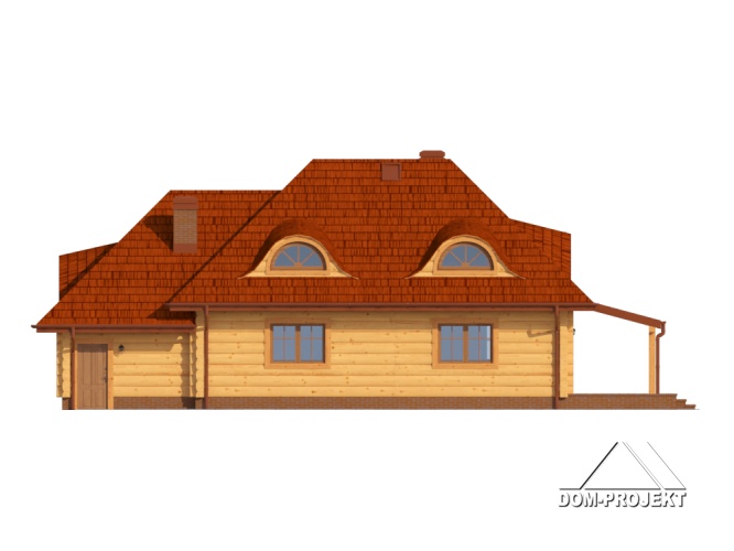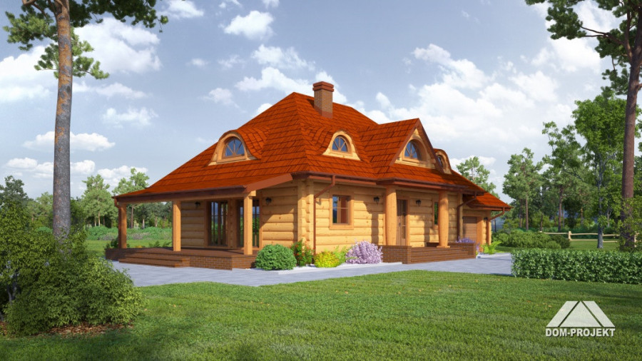 Dom z bali drewnianych. Duży salon z aneksem kuchennym, kominkiem, wyjściem na zadaszony taras. Łazienka, wiatrołap, komunikacja, garderoba, garaż i kotłownia. Na poddaszu pięć pokoi, łazienka i komunikacja.