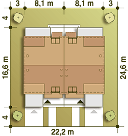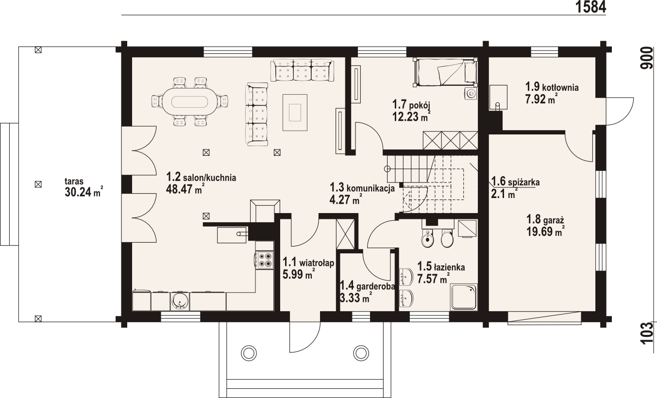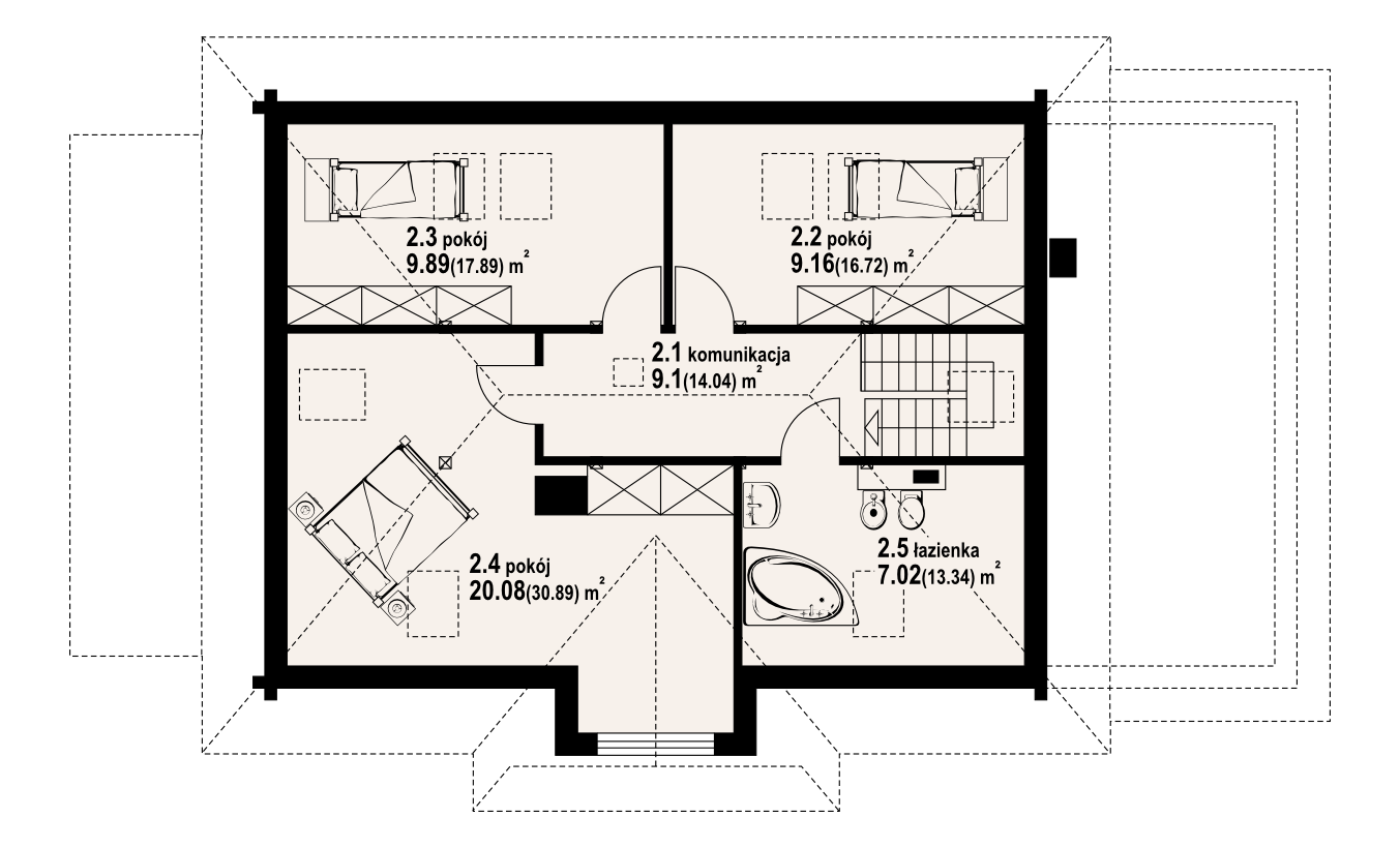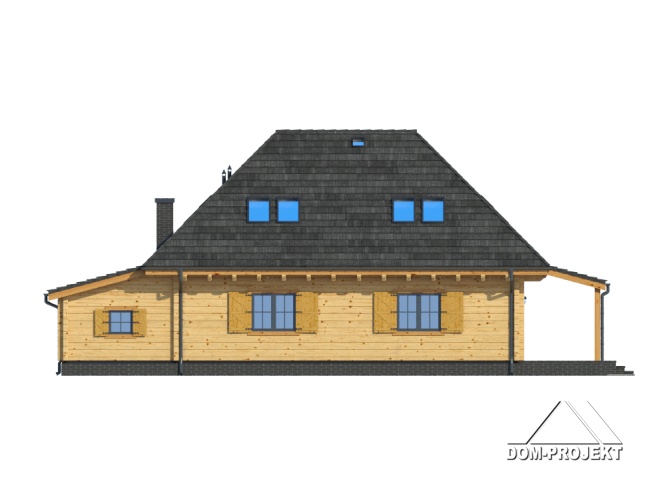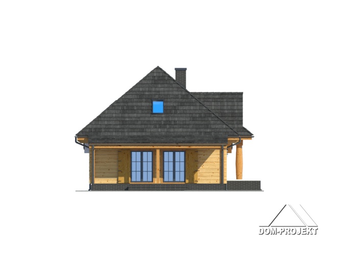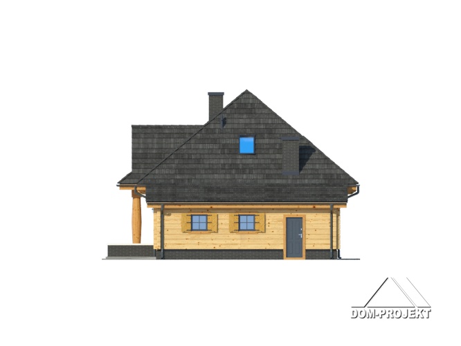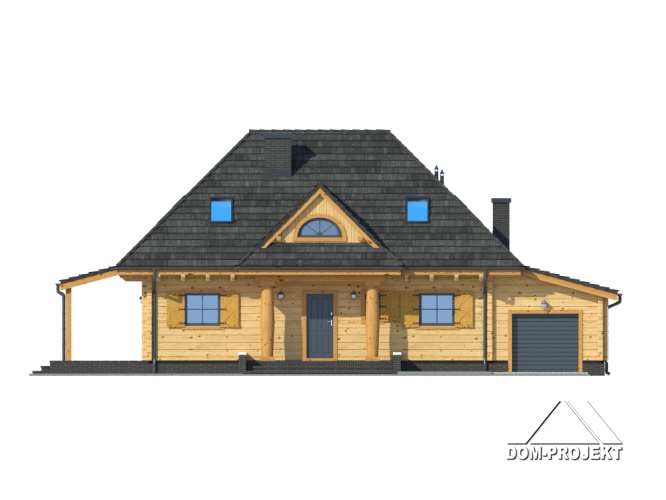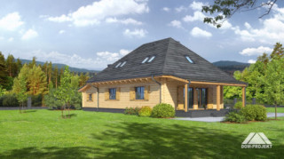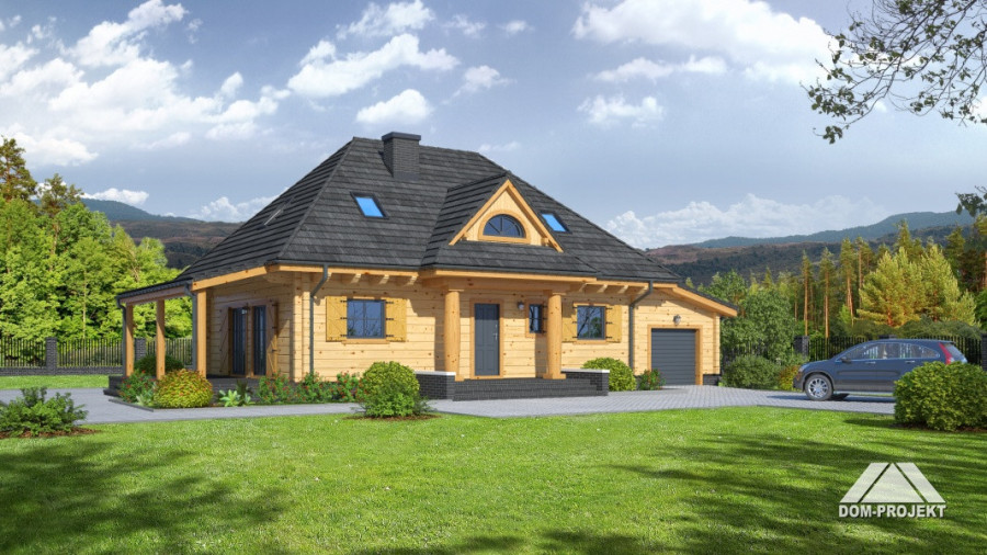 Dom z użytkowym poddaszem o bardzo ciekawej architekturze. W strefie dziennej na parterze duży salon z aneksem kuchennym, ponadto dodatkowy pokój, łazienka i garderoba. W strefie nocnej na poddaszu znajdują się trzy sypialnie i łazienka. Dobudowany garaż i usytuowana na jego przedłużeniu kotłownia stanowią uzupełnienie programu funkcjonalnego domu.