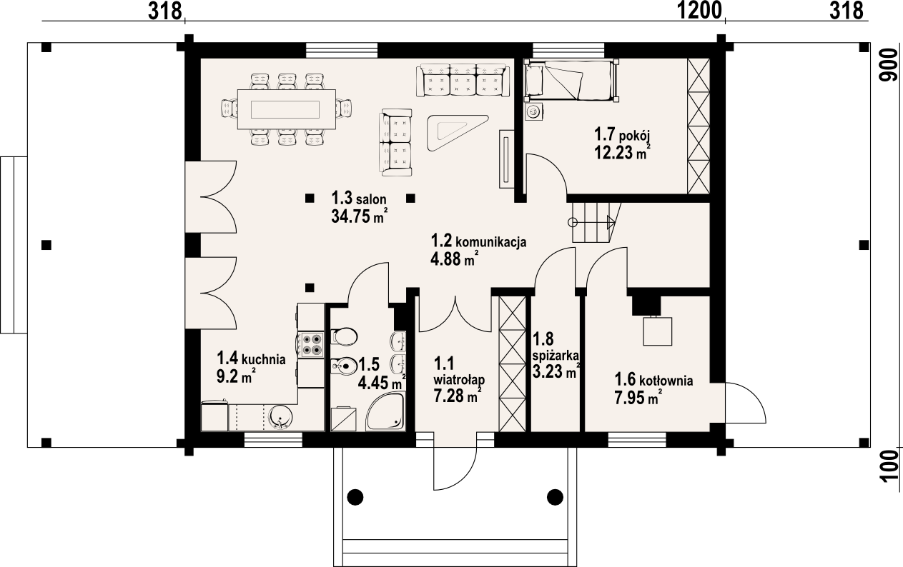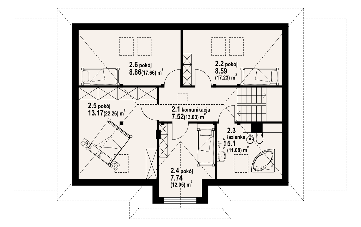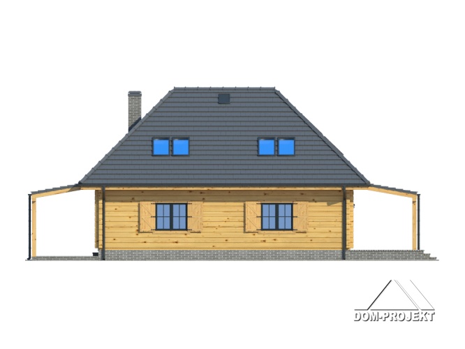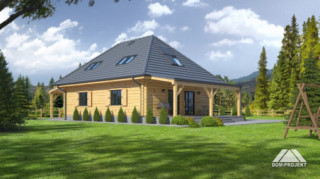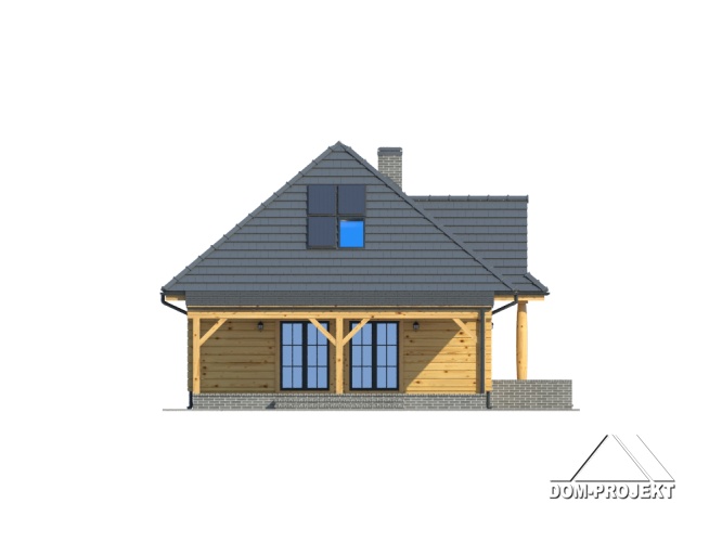 Dom z poddaszem użytkowym przeznaczony dla 4 - 5-cioosobowej rodziny. Funkcjonalny układ pomieszczeń umożliwia optymalne wykorzystanie przestrzeni. Parter to strefa dzienna w skład której wchodzą spory salon z kominkiem oraz otwarta na salon kuchnia. Dodatkowo znajdują się tu pokój-gabinet, łazienka, spiżarka oraz obszerne pomieszczenie kotłowni. Na poddaszu strefa nocna z czterema sypialniami oraz łazienką. Na zalety domu wpływają ponadto zadaszony taras i wiata.