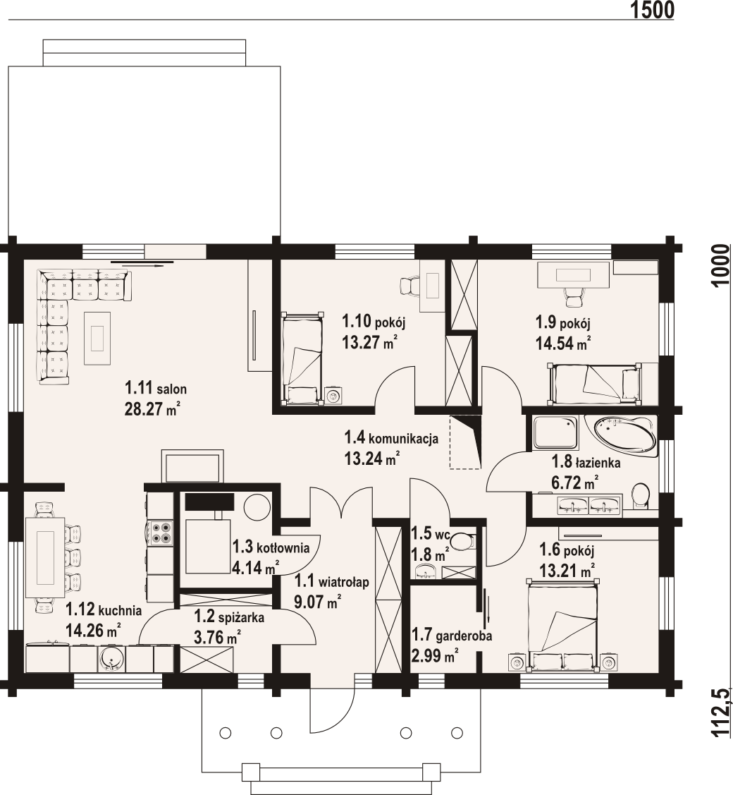 Parterowy dom o bardzo funkcjonalnym układzie pomieszczeń. Kominek w salonie z możliwością rozprowadzenia ciepła. Wydzielona kotłownia i spiżarka. Kuchnia częściowo otwarta na salon, trzy sypialnie w tym jedna z garderobą.
