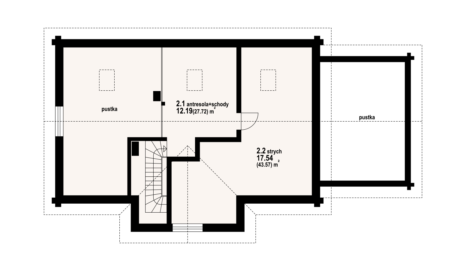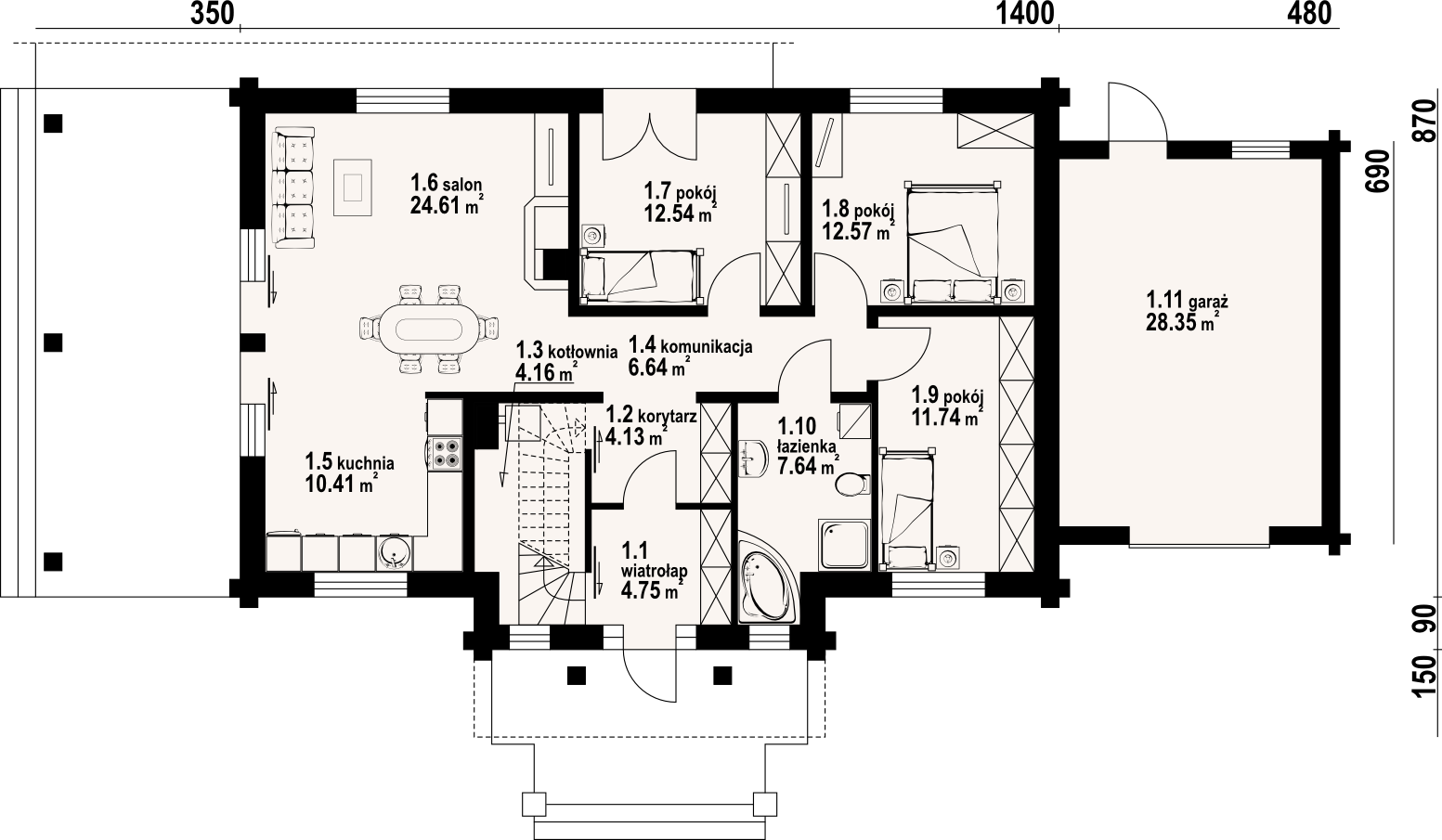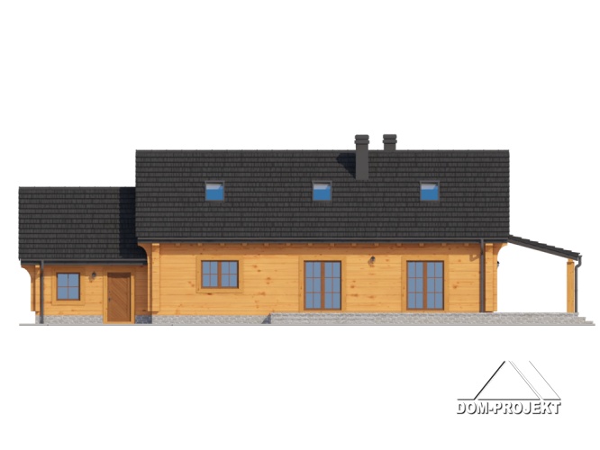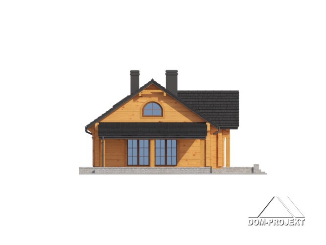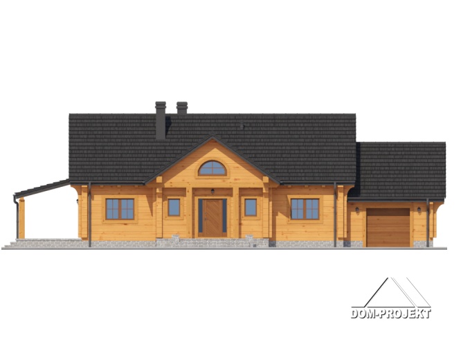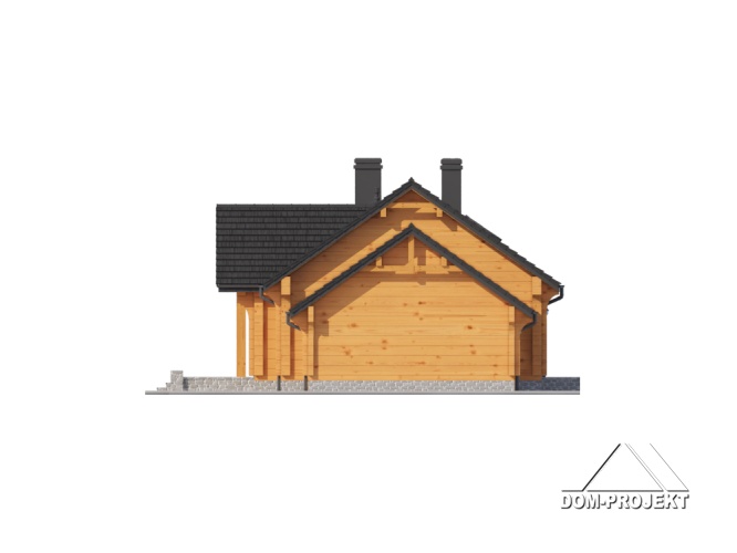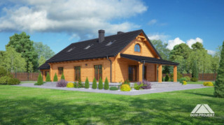 Dom z bali. Parterowy. Duży salon z aneksem kuchennym, kominkiem i wyjściem na zadaszony taras. Trzy pokoje, łazienka, wiatrołap, komunikacja, korytarz, kotłownia i garaż. Wyjście schodami na poddasze. Na poddaszu antresola,pustka nad salonem i strych.