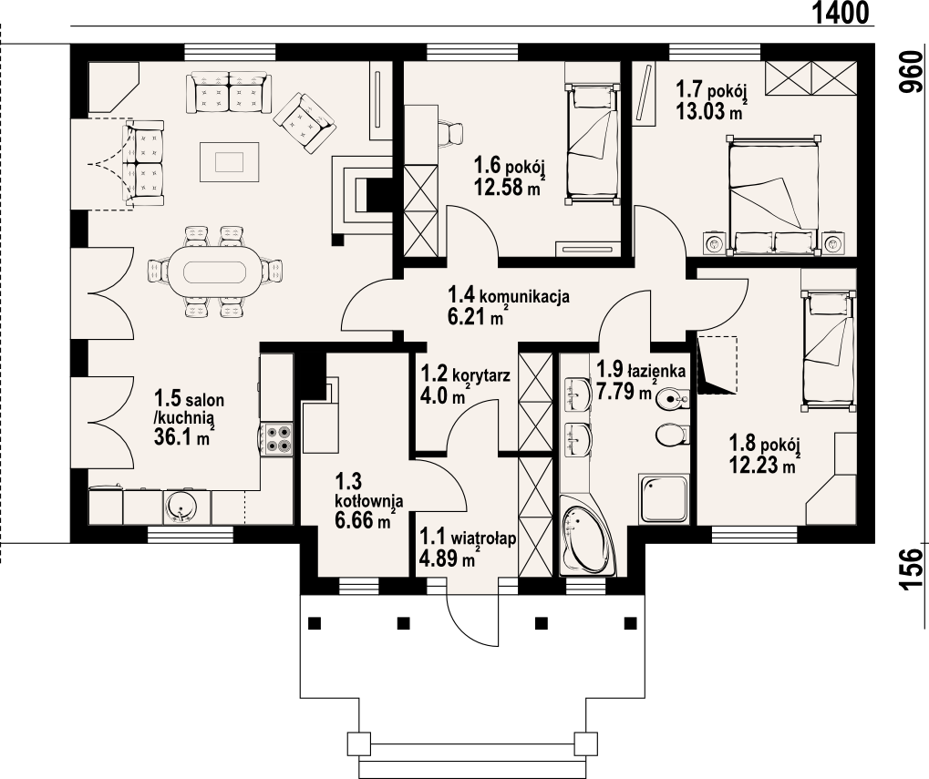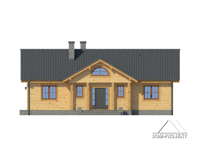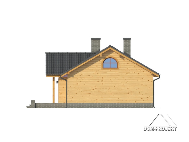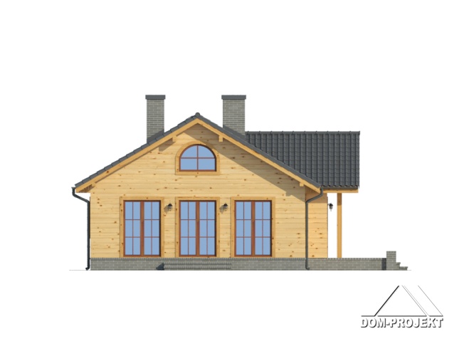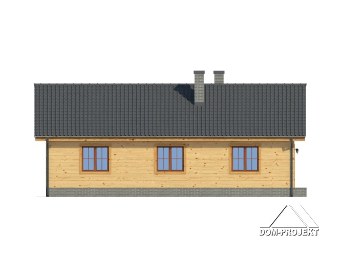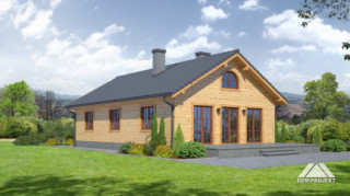 Parterowy dom w konstrukcji szkieletu drewnianego. Duży salon z aneksem kuchennym, kominkiem i wyjściami na taras. Trzy pokoje, łazienka, komunikacja, kotłownia i wiatrołap. Poddasze nieużytkowe (strych).