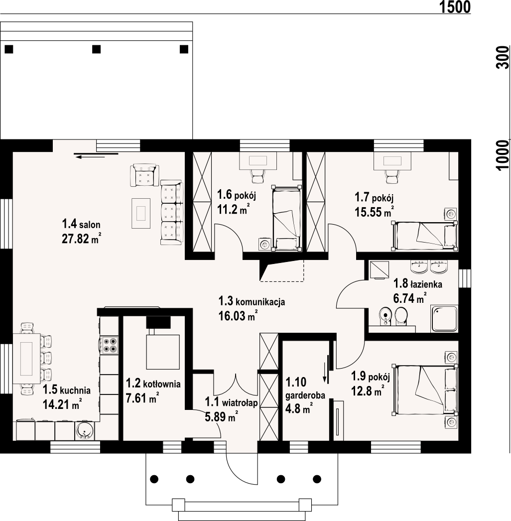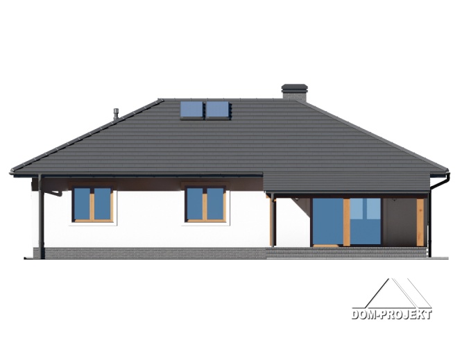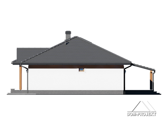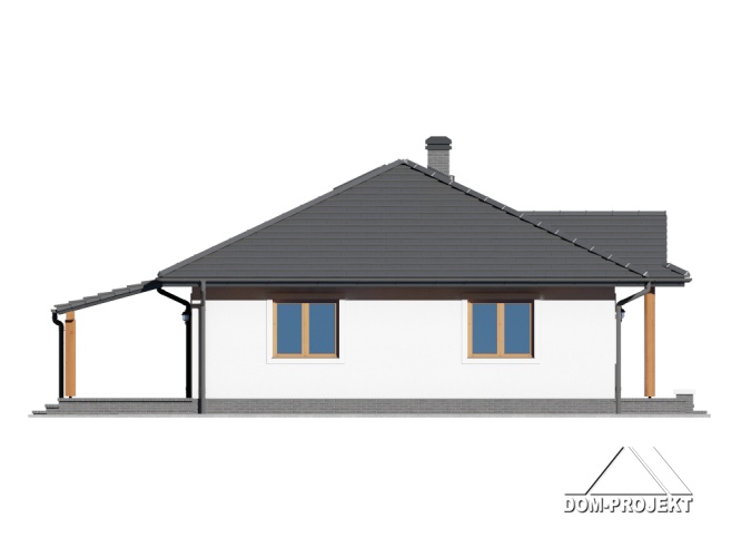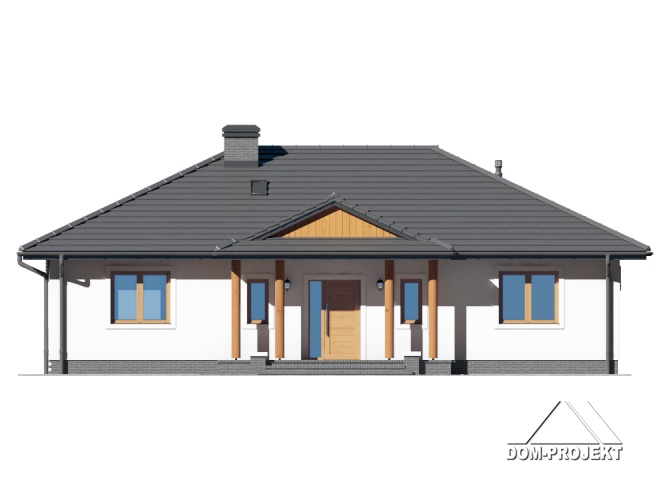 Dom parterowy. Duży salon z aneksem kuchennym i wyjściem na zadaszony taras. Trzy pokoje, łazienka, garderoba, komunikacja, wiatrołap i kotłownia. Poddasze nieużytkowe. Wyjście na poddasze schodami rozkładanymi.