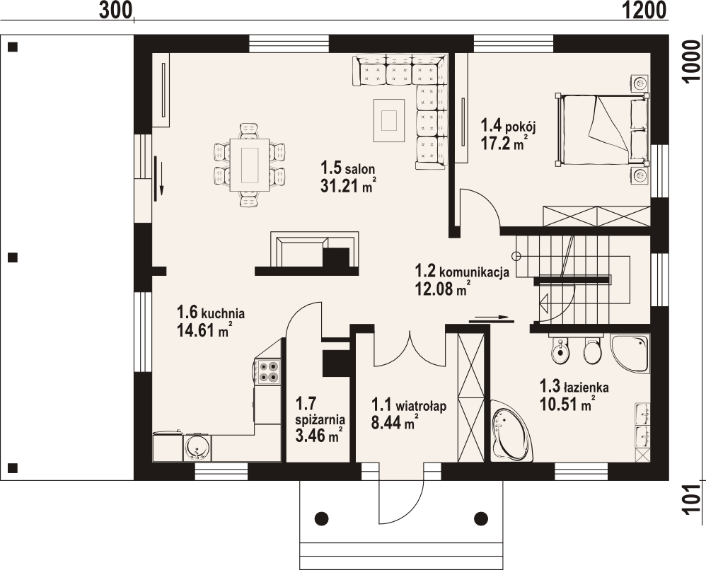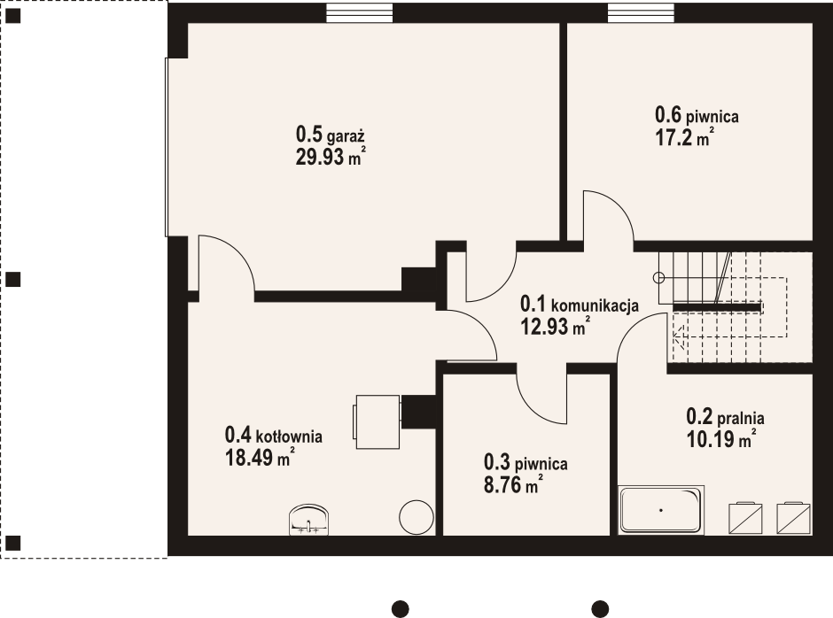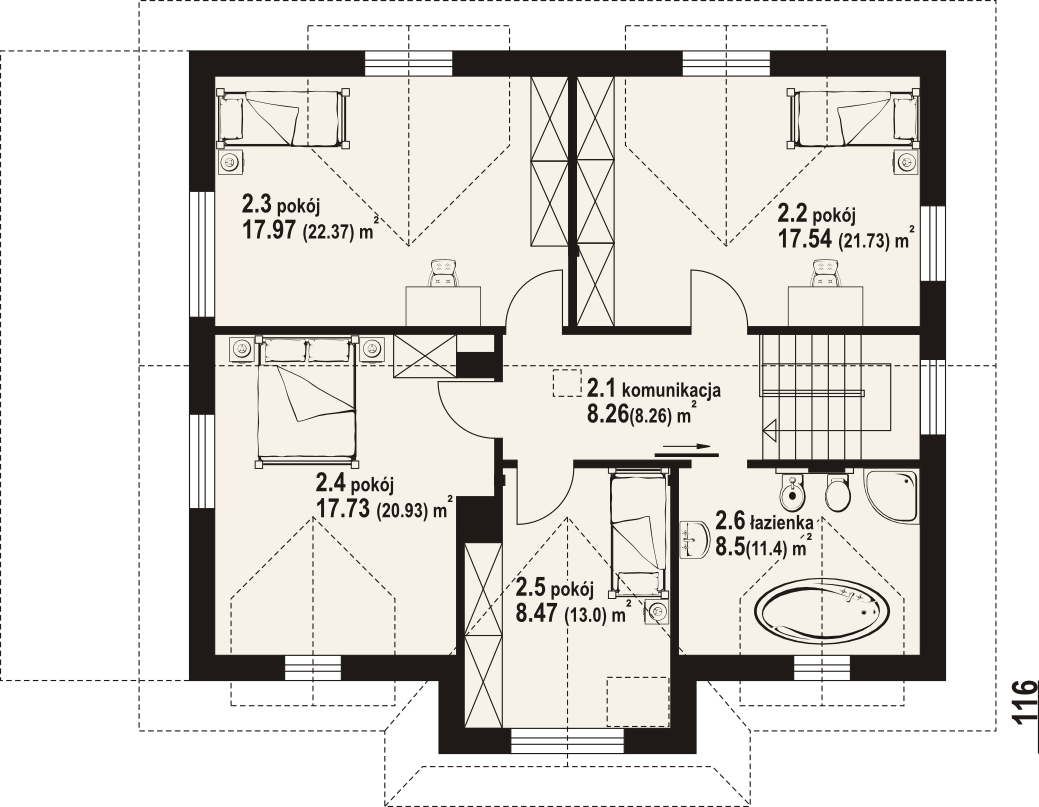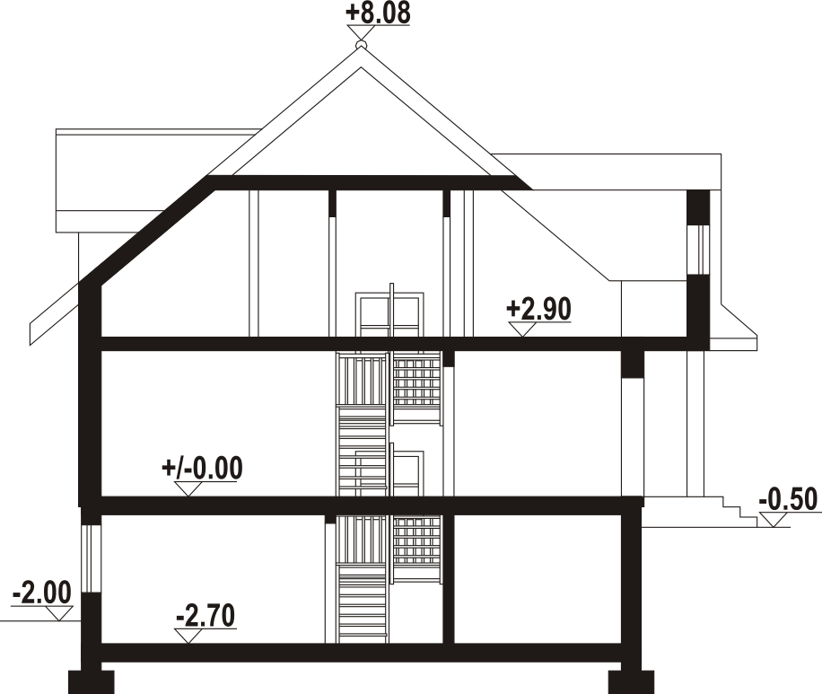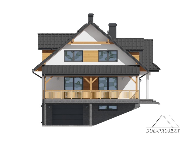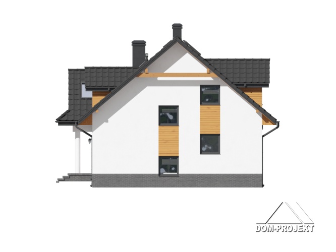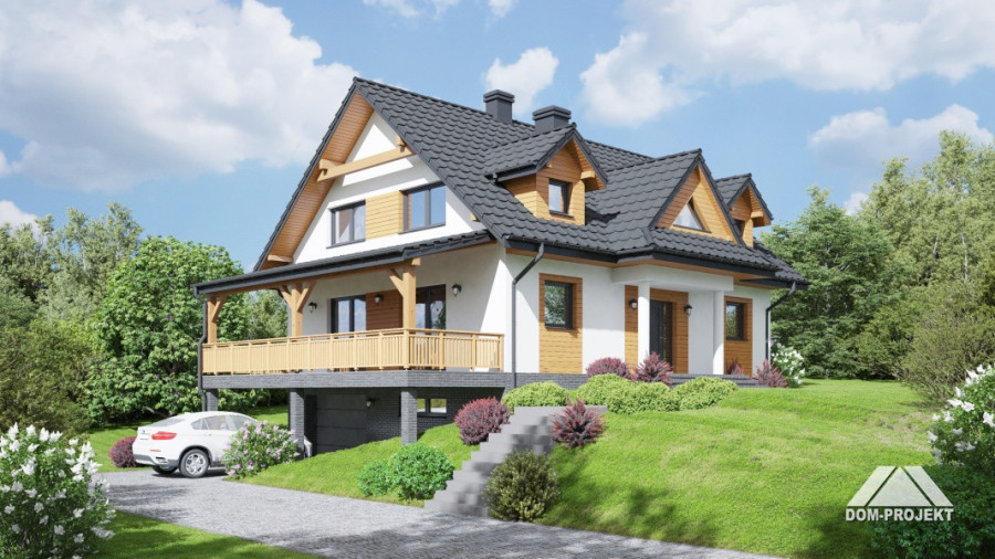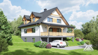 Funkcjonalny dom, doskonały dla osób szukających projektu na działkę ze spadkiem terenu. Na parterze do dyspozycji salon z wygodną kuchnią i spiżarką, dodatkowy pokój , oraz łazienka. Na poddaszu przewidziano cztery dobrze doświetlone sypialnie i łazienkę. Zaplecze gospodarcze domu zlokalizowano w piwnicy.