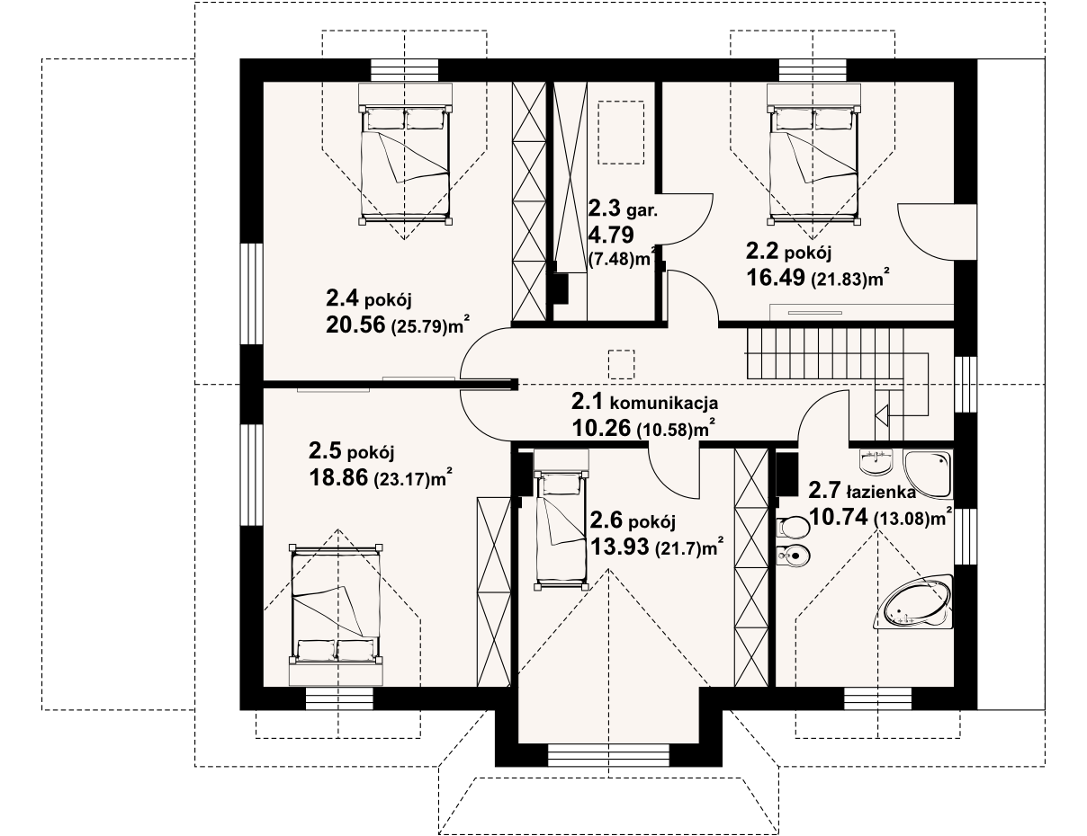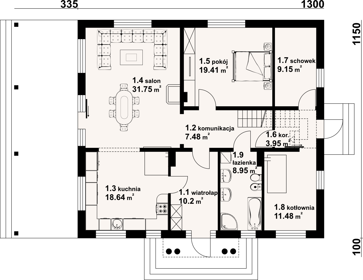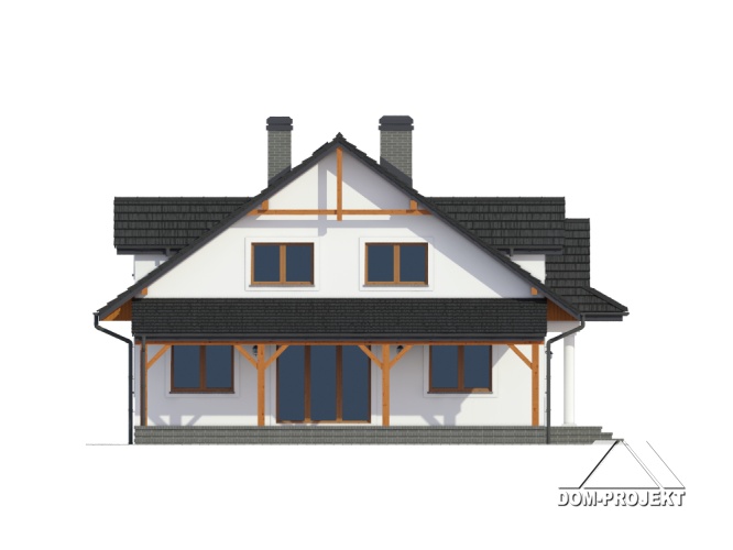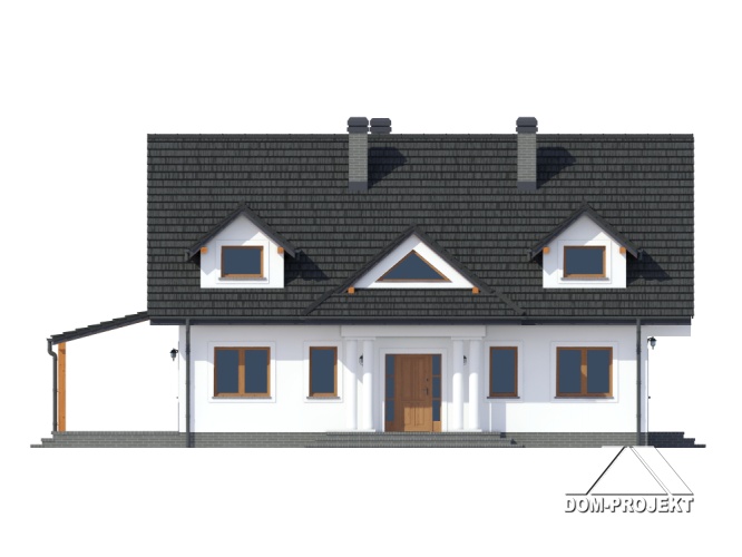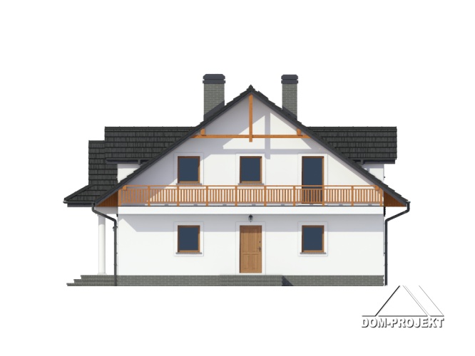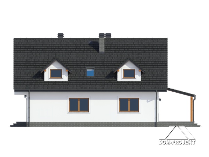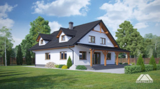 Wygodny dom z 6 pokojami i 2 łazienkami. Duży salon z kominkiem, wyjściem na taras i otwarciem na kuchnię. Kuchnia, pokój, łazienka, komunikacja, wiatrołap, kotłownia, schowek. Na poddaszu cztery pokoje, łazienka, garderoba i komunikacja. Zwarta bryła budynku i dach dwuspadowy sprzyjają szybkiej i taniej budowie i niskim kosztom eksploatacji.