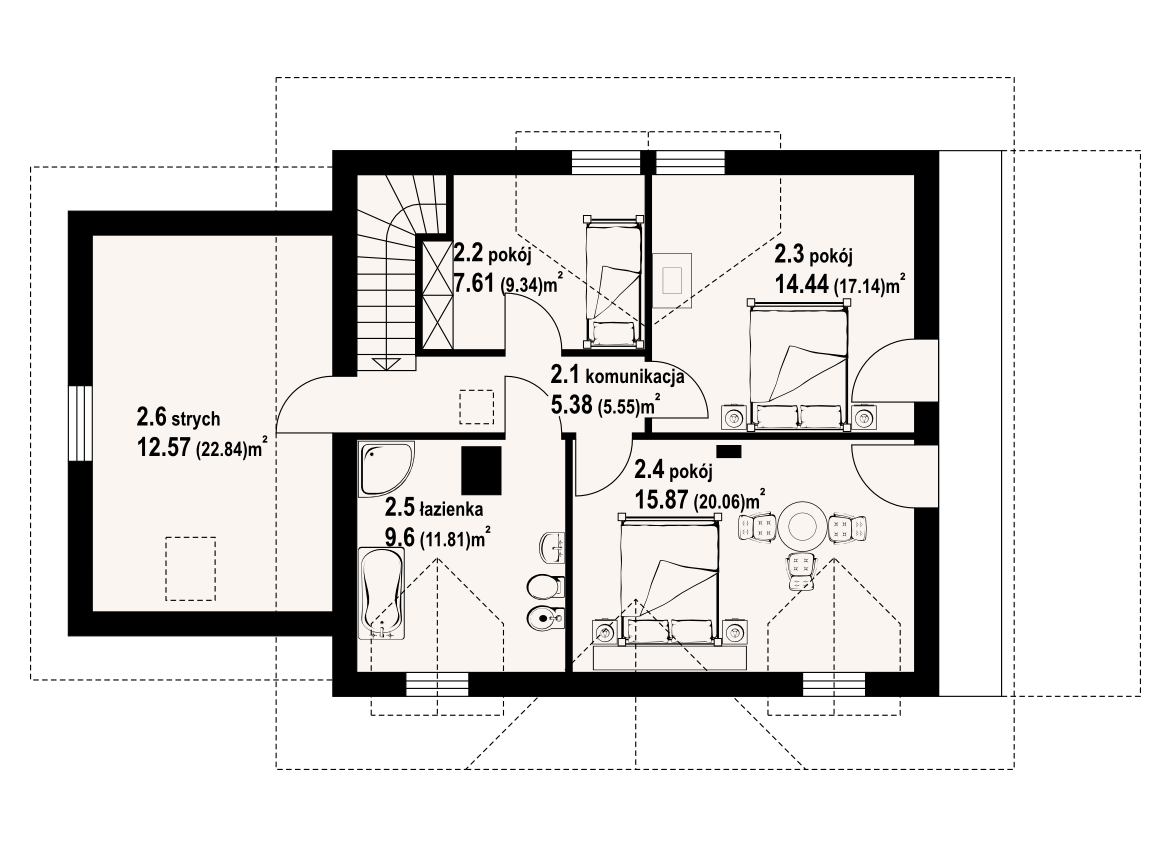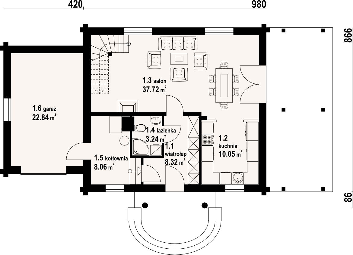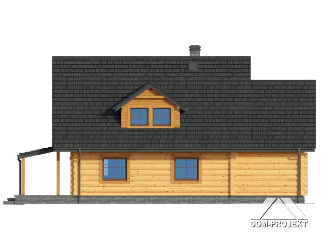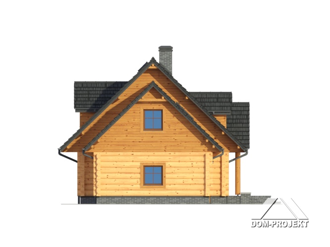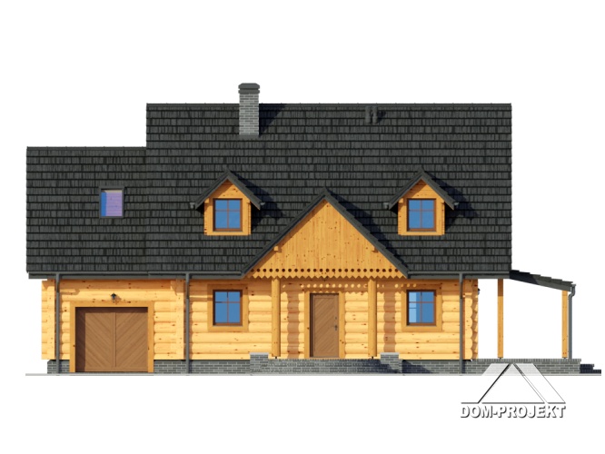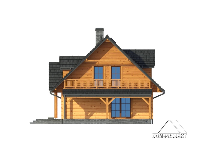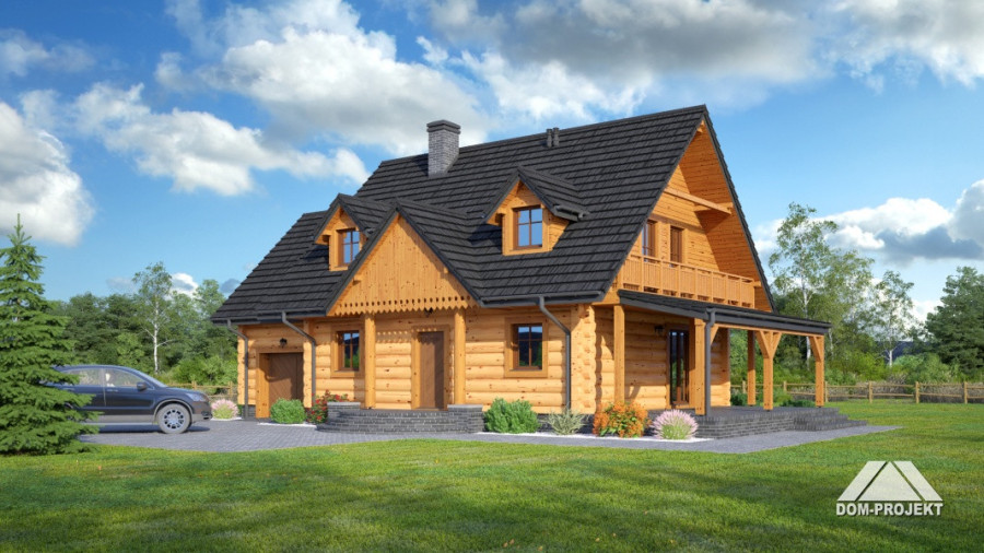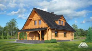 Dom z bali drewnianych. Duży salon z aneksem kuchennym, kominkiem, wyjściem na taras i schodami na poddasze. Wiatrołap, łazienka, kotłownia i garaż. Na poddaszu trzy pokoje, łazienka, komunikacja, balkon i strych. Zwarta bryła budynku i dach dwuspadowy sprzyjają szybkiej i taniej budowie oraz niskim kosztom eksploatacji.
