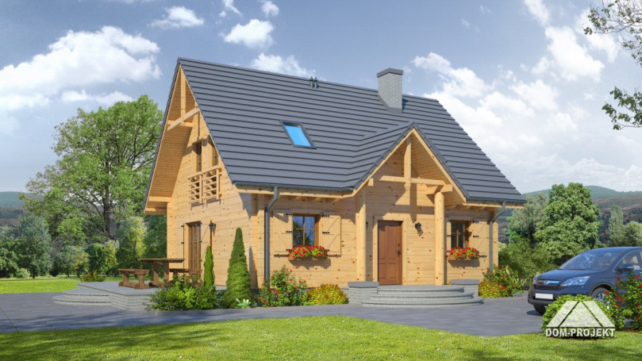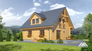 Dom z bali drewnianych. Duży salon z aneksem kuchennym, kominkiem, wyjściem na taras i schodami na poddasze. Wiatrołap, łazienka i kotłownia. na poddaszu trzy pokoje, łazienka i komunikacja Zwarta bryła budynku i dach dwuspadowy sprzyjają szybkiej i taniej budowie oraz niskim kosztom eksploatacji.