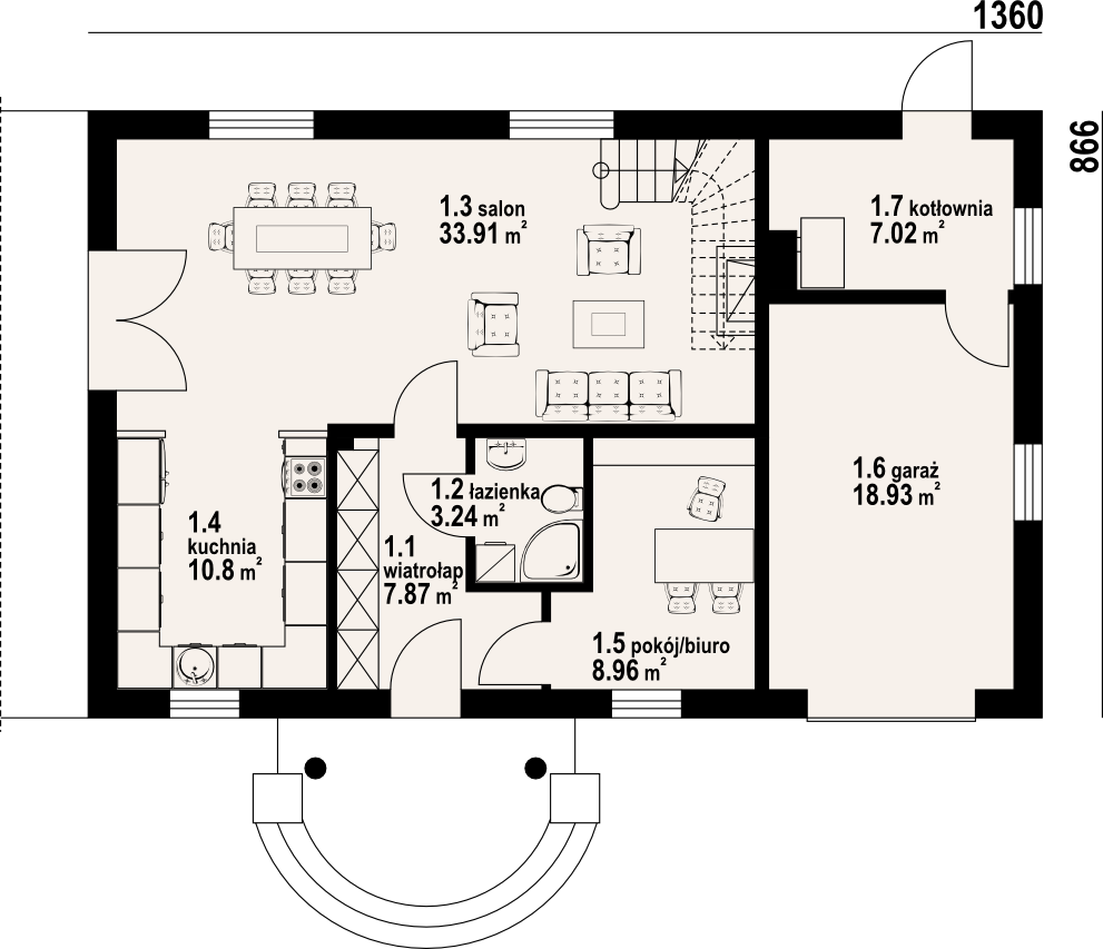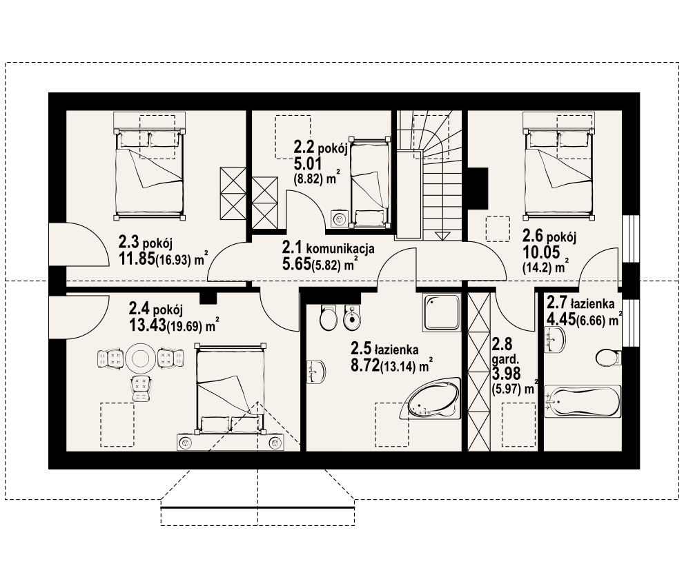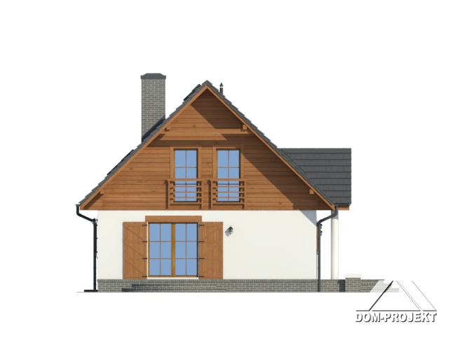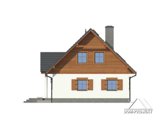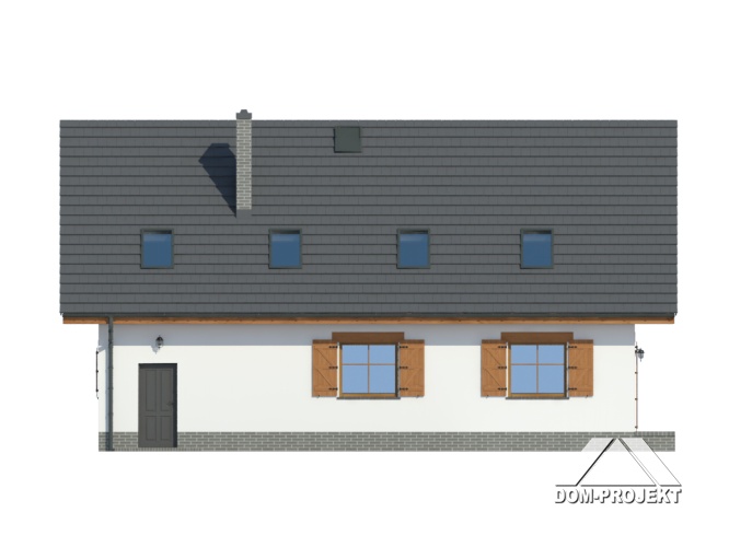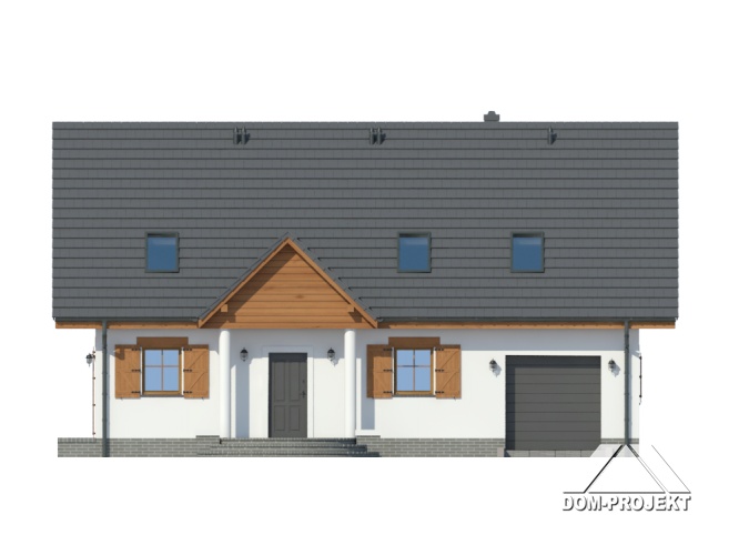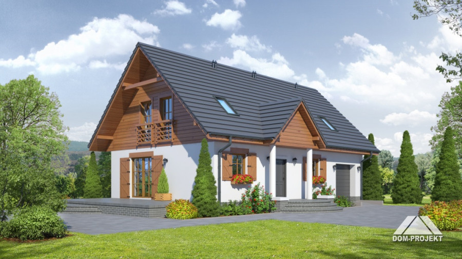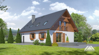 Dom z poddaszem użytkowym. Duży salon z aneksem kuchennym, kominkiem i wyjściem na taras. Wiatrołap, łazienka i pokój (lub biuro w domu). Na poddaszu cztery pokoje, dwie łazienki, garderoba i komunikacja. Zwarta bryła budynku oraz dach dwuspadowy sprzyjają szybkiej i taniej budowie oraz niskim kosztom eksploatacji.