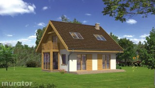 Pomimo niewielkich rozmiarów i prostej, skromnej bryły, dom jest pełen uroku. O jego urodzie decydują przede wszystkim umiejętnie dopasowane detale – wysunięty daszek nad wejściem, deskowanie fragmentów ścian szczytowych na poddaszu i przy oknach oraz szklany wykusz, a także ciepła, brązowo-beżowa kolorystyka elewacji. Planując wnętrze kierowano się zasadą rozdzielenia pomieszczeń o różnych funkcjach. Kuchnia z oknem wychodzącym od frontu jest oddzielona od salonu ścianą z kominkiem. Znajdzie się tu miejsce na mały stół, przy którym można wypić poranną kawę. Słoneczny, przytulny salon połączono z jadalnią, umiejscowioną w wykuszu okiennym. Przestrzeń <b>pokoju dziennego</b> powiększa duży taras, który może stać się letnim pokojem. Na parterze zaplanowano też dużą sypia