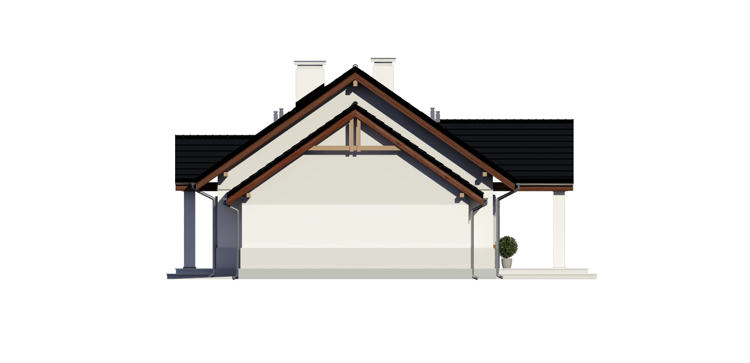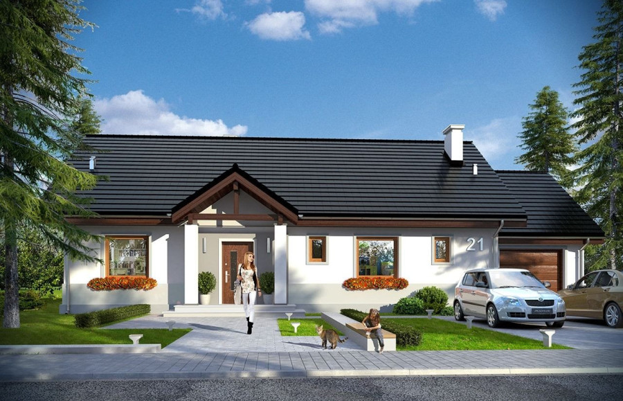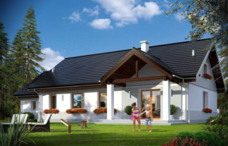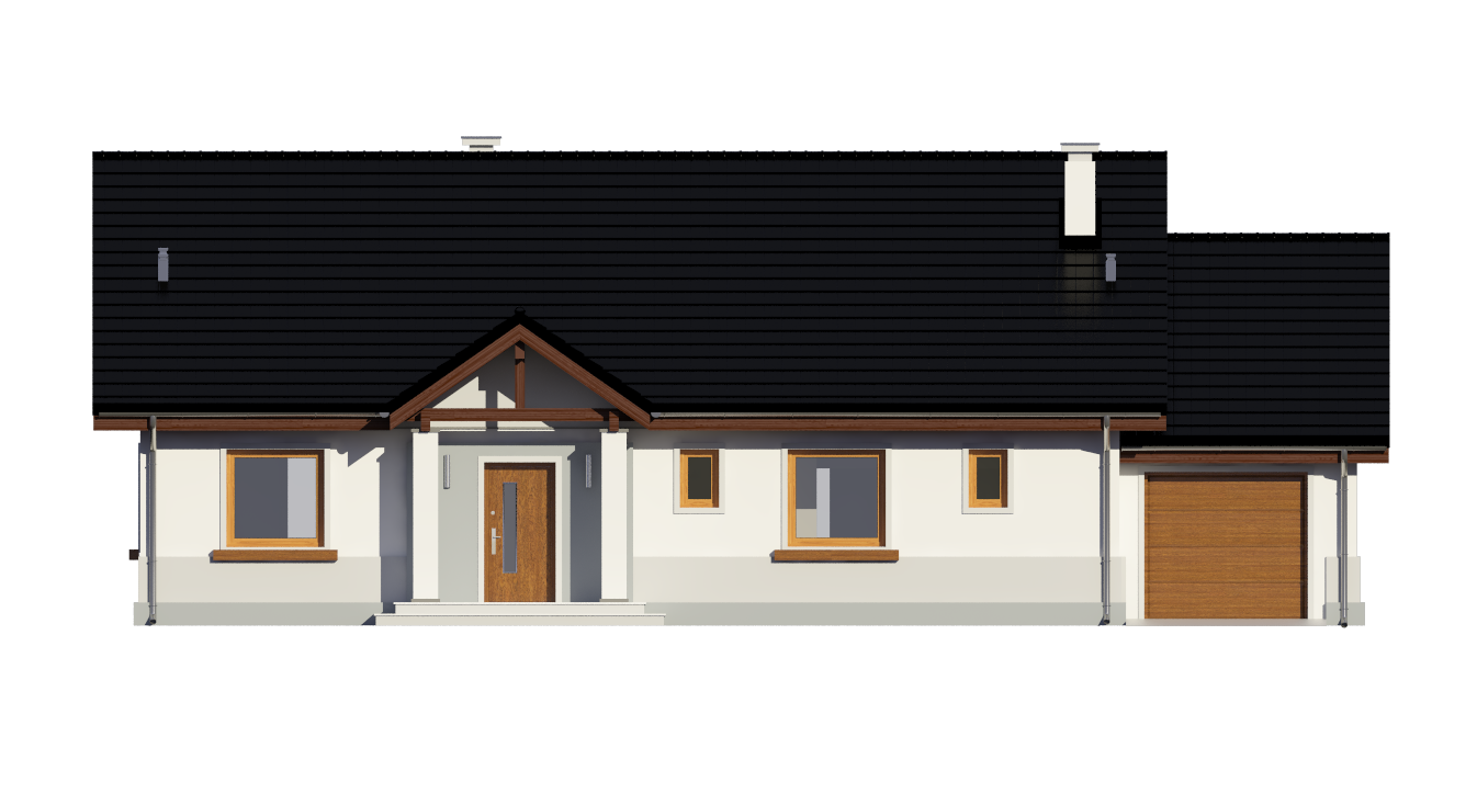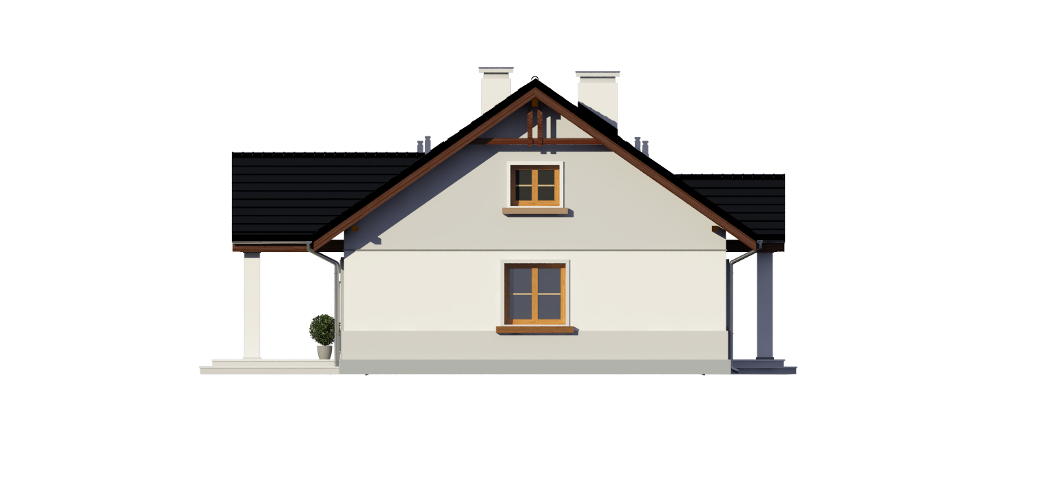 Cukiereczek to sympatyczny domek jednorodzinny dla rodziny cztero-sześcioosobowej. Parterowy dom z poddaszem użytkowym, przekryty dwuspadowym dachem, częściowo wbudowanym w bryłę garażem. Architektura domku stanowi połączenie skromnego, oszczędnego w detale wyglądu zewnętrznego, z jednoczesnym zachowaniem ludzkiej skali bryły. Projekt charakteryzuyje się funkcjonalnym, logicznie zaplanowanym wnętrzem. Na parterze zaprojektowano obszerny salon z częściowo oddzieloną jadalnią, z której jest połączenie z półotwartą kuchnią i wyjście do podcienia ogrodowego i na taras. W salonie przewidziano miejsce na wbudowany w ścianę kominek. Z salonu widoczne są także częściowo schody, zaczynające swój bieg w holu - tuż przy wejściu. Na parterze zaplanowano też dodatkowy pokój - gabinet lub sypialnię