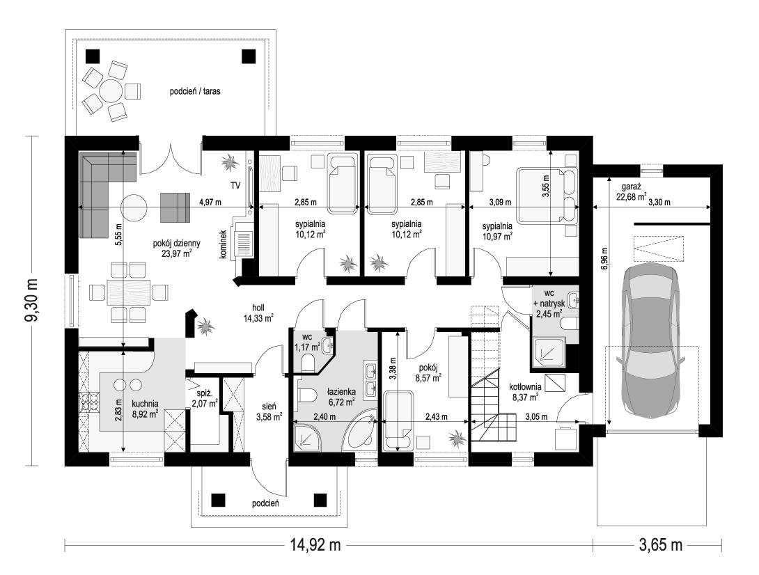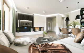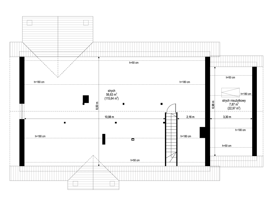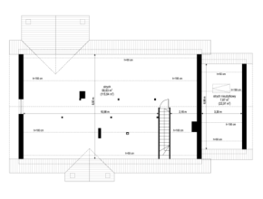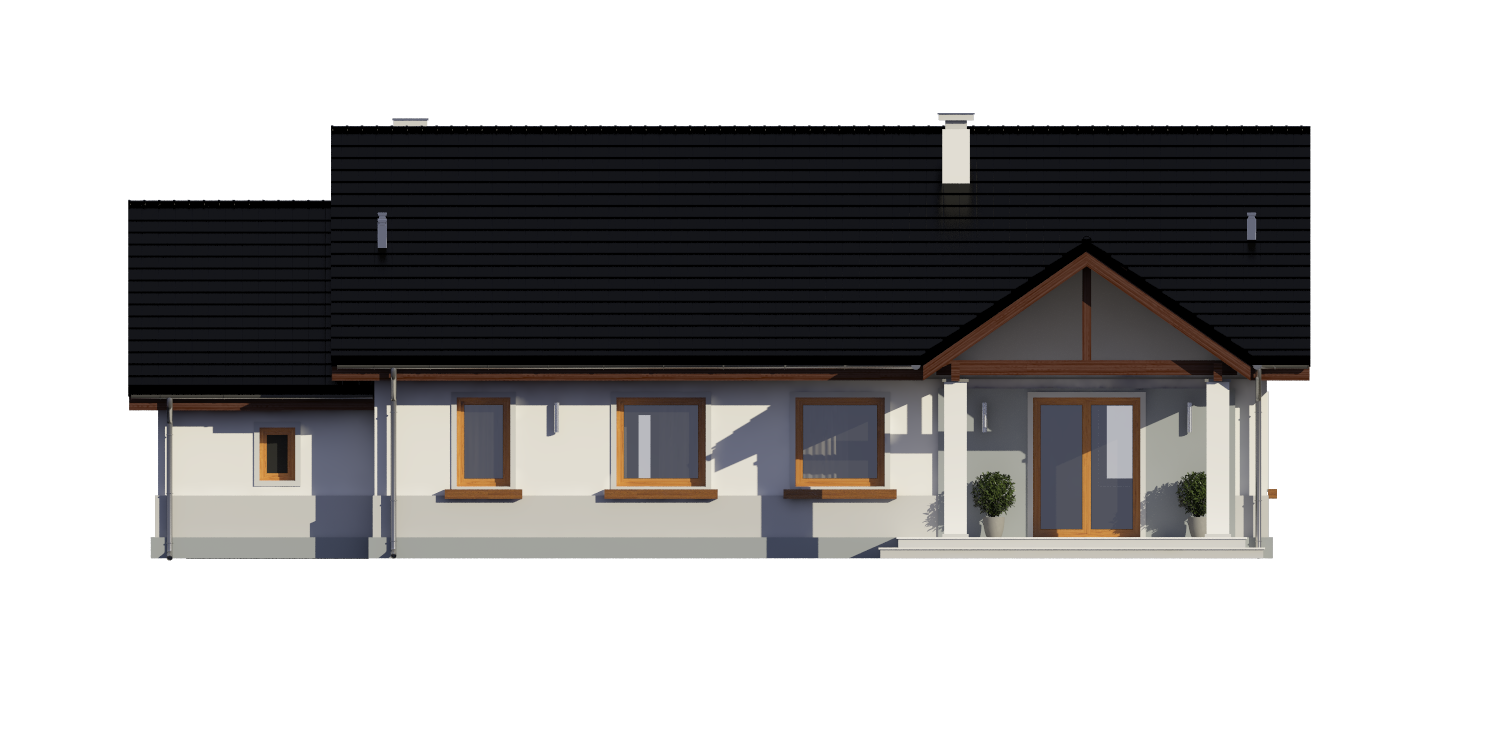 Cukiereczek to sympatyczny domek jednorodzinny dla rodziny cztero-sześcioosobowej. Parterowy dom z poddaszem użytkowym, przekryty dwuspadowym dachem, częściowo wbudowanym w bryłę garażem. Architektura domku stanowi połączenie skromnego, oszczędnego w detale wyglądu zewnętrznego, z jednoczesnym zachowaniem ludzkiej skali bryły. Projekt charakteryzuyje się funkcjonalnym, logicznie zaplanowanym wnętrzem. Na parterze zaprojektowano obszerny salon z częściowo oddzieloną jadalnią, z której jest połączenie z półotwartą kuchnią i wyjście do podcienia ogrodowego i na taras. W salonie przewidziano miejsce na wbudowany w ścianę kominek. Z salonu widoczne są także częściowo schody, zaczynające swój bieg w holu - tuż przy wejściu. Na parterze zaplanowano też dodatkowy pokój - gabinet lub sypialnię