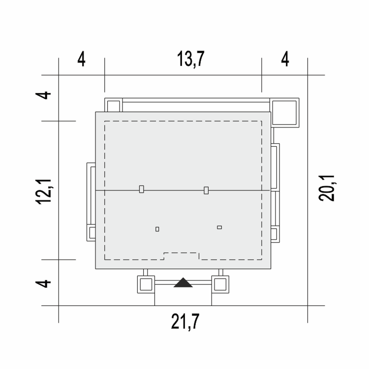 W piwnicy znajdują się pomieszczenia gospodarcze i kotłownia. Na parterze umieszczono jedno mieszkanie , zawierające pokój dzienny, 2 pokoje sypialne, hol, łazienkę z w.c., kuchnię i sień. Na poddaszu znajduje się drugie mieszkanie z kuchnią, pokojem dziennym, 2 pokojami sypialnymi, gabinetem i łazienką. Bryłę budynku tworzą dwa prostopadłościany zestawione w kształcie litery "T" przykryte dwoma przenikającymi się pod kątem prostym dachami dwuspadowymi.
