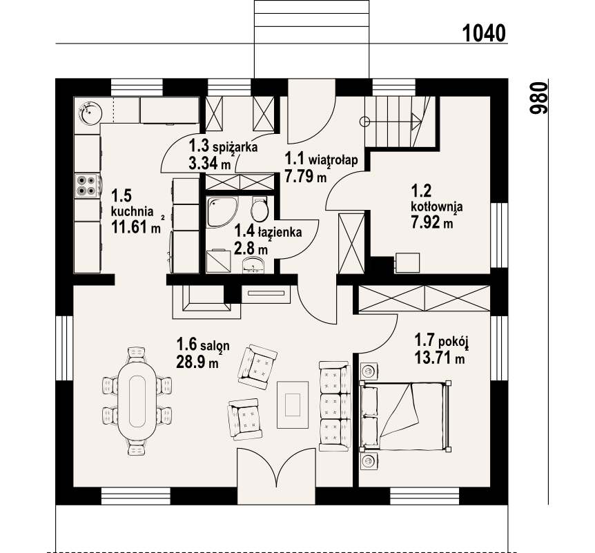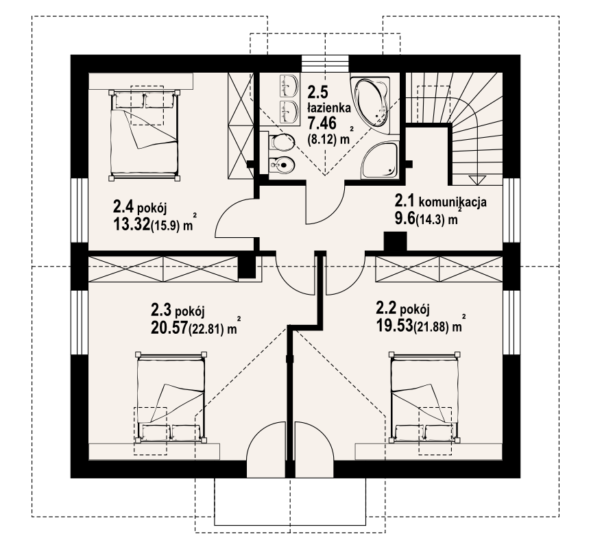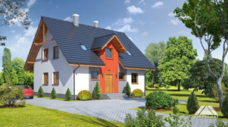 Dom z poddaszem mieszkalnym o prostej, klasycznej architekturze. Salon, wydzielona kuchnia i pokój na parterze. Ponadto kotłownia, łazienka i spiżarka. W salonie kominek. Na poddaszu trzy przestronne pokoje sypialne i łazienka.