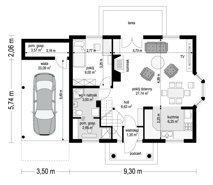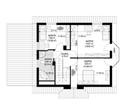 Cztery kąty 4 stworzono z myślą o rodzinie trzy-czteroosobowej. Budynek parterowy, przekryty czterospadowym dachem, z zadaszonym portykiem wejściowym i podcieniem tarasowym od strony ogrodu. Zwarta prostokątna bryła domu jest łatwa w budowie i niedroga w eksploatacji. Nad stropem nad parterem kryje się strych do wykorzystania na magazyn, co rekompensuje brak innych pomieszczeń gospodarczych w domu. Spokojna, tradycyjna forma architektoniczna budynku wpisze się doskonale w każdy podmiejski krajobraz. Domek jest przytulny i proporcjonalny. Wnętrze domu podzielono na część dzienną z salonem, holem i półotwartą kuchnią, oraz część nocną - z trzema sypialniami, łazienką i niewielkim pomieszczeniem kotłowni. Wejście do kotłowni można zaprojektować z zewnątrz - wówczas można dom ogrzewać kotł