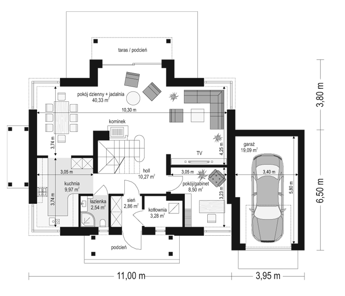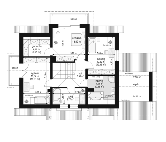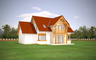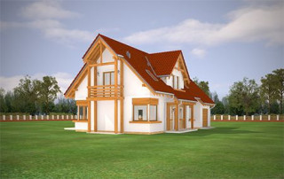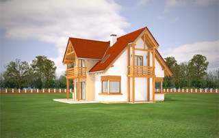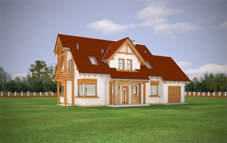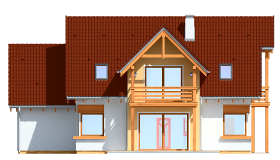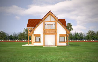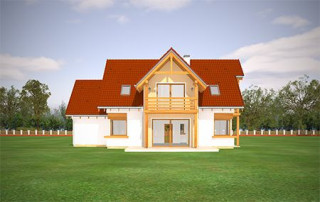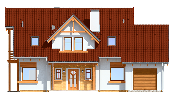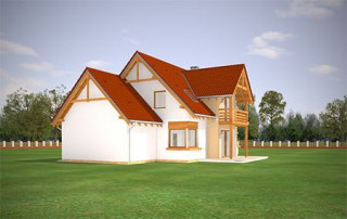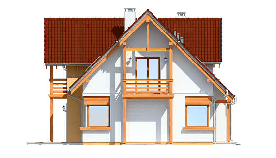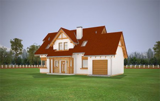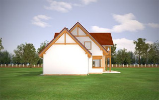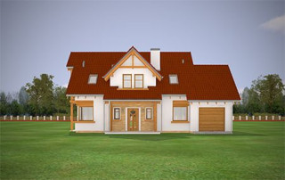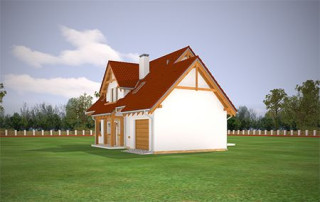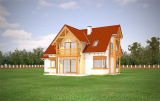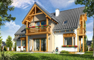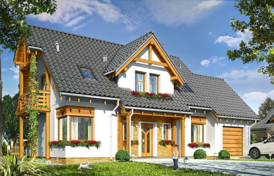 Projekt domu Bartek to dom jednorodzinny dla 4- 5-osobowej rodziny, o ciekawej architekturze, wzorowanej na regionalnych tradycjach. Idealny dla Inwestorów znudzonych typowymi nawiązaniami do polskich dachowców z kolumienkami, szukającymi innej stylistyki. Budynek jednorodzinny z pojedynczym garażem. Projekt domku Bartek architektura i wnętrze Gotowy projekt Bartek to prosta bryła z poddaszem użytkowym, przykryta dwuspadowym dachem, z dobudowanym garażem. Dom ozdabiają od frontu i od ogrodu duże lukarny z ciekawymi drewnianymi detalami. Również szczyt projektu Bartek został ozdobiony ciekawie zaprojektowanym balkonem z daszkiem. W projekcie Bartek nawiązanie do tradycji łączy się z nowoczesnością. Narożne okna projektu Bartek, czy duże przeszklone drzwi na taras dodają nowoczesnego sznytu. Wnętrze projektu Bartek zaplanowano wokół centralnie ustawionych schodów. W projekcie domku Bartek z holu przechodzimy do przestrzeni dziennej składającej się z kącików: telewizyjnego, kominkowego i jadalni. Razem z holem i częściowo otwartą kuchnią salon tworzy bardzo ładną wspólną powierzchnię. Na parterze projektu Bartek mieści się też kotłownia, łazienka, dodatkowy pokój i dobudowany garaż. Na poddaszu projektu Bartek znajdują się trzy sypialnie, duża łazienka, garderoba rodziców i dodatkowy niewielki pokój do pracy. Projekt Bartek dzięki zwartości bryły i zastosowanym materiałom jest energooszczędny. Bartek będzie niedrogi w budowie i późniejszej eksploatacji. Dom można zbudować na działce o wymiarach: szerokość min 22,05 m i długość min 18,40 m. Projekt Bartek z pracowni MGProjekt można zamówić też w wersji odbicia lustrzanego.