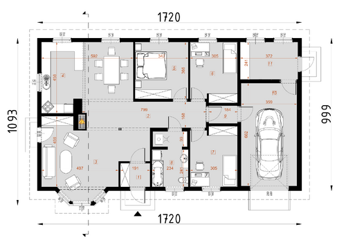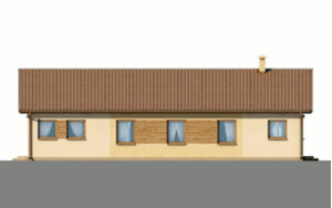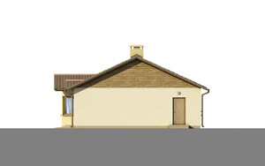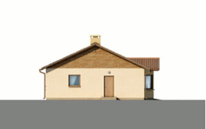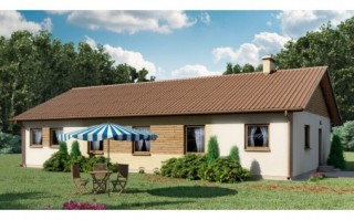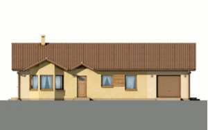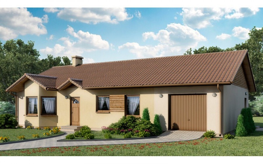 Z sieni dostajemy się do hallu, z którego możemy przejść do obszernego pokoju dziennego z wykuszem, połączonego z kuchnią i jadalnią. Po prawej stronie hallu znajduje się podłużny korytarz, z którego możemy dostać się do trzech sypialni i łazienki. Znajduje się tu również śluza łącząca budynek z garażem jednostanowiskowym, posiadającym dodatkowo warsztat.
