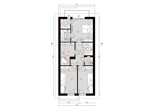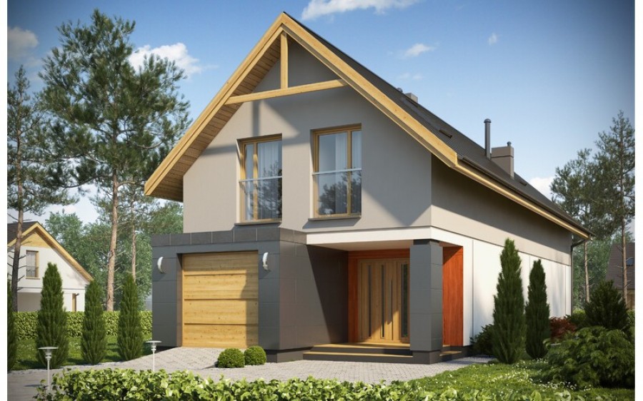 Gotowy projekt D102C to nowoczesny dom jednorodzinny z poddaszem przeznaczony dla czteroosobowej rodziny. Dom idealny na wąska działkę. Prosta forma o nieskomplikowanej konstrukcji zaprojektowana na planie prostokąta zwieńczona dwuspadowym dachem pozwoli na szybką i ekonomiczną budowę oraz późniejszą eksploatację. Białą kolorystykę urozmaicają drewniane wykończenia elewacji. Zadaszony taras wraz z balkonem stanowią ciekawy i nowoczesny element bryły budynku. Projekt domu jednorodzinnego D102A jest doskonałą propozycją dla rodzin preferujących rozkład pomieszczeń podzielony na cześć dzienną i nocną, które cenią funkcjonalność, ale także elegancję i nowoczesność.