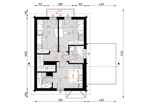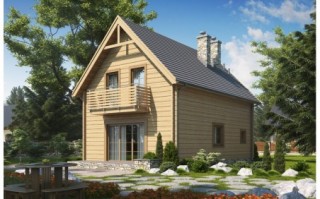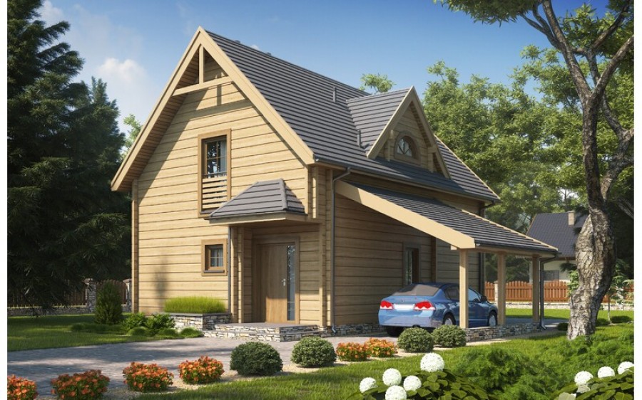 D134 Dom mieszkalny jednorodzinny w technologii drewnianej - bal - płazy drewniane. Idealny dla 4-5-osobowej rodziny. Może również pełnić funkcję domku letniskowego. Prosta bryła budynku oraz nieskomplikowana konstrukcjawpływają na niższe koszty budowy. Bardzo funkcjonalny podział pomieszczeń z oddzielną strefą techniczną, strefą dzienną na parterze i nocną na poddaszu. Dodatkowo wiata.