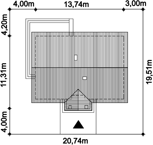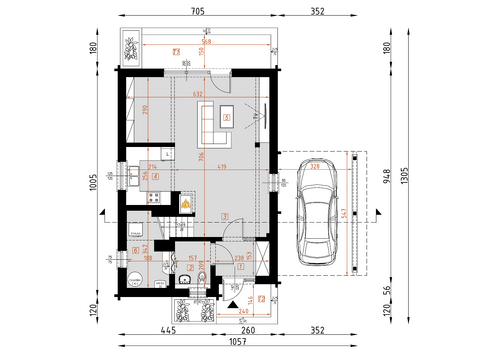 wpływają na niższe koszty budowy. Bardzo funkcjonalny podział pomieszczeń z oddzielną strefą techniczną, strefą dzienną na parterze i nocną na poddaszu. Dodatkowo wiata.