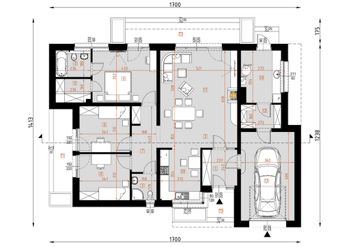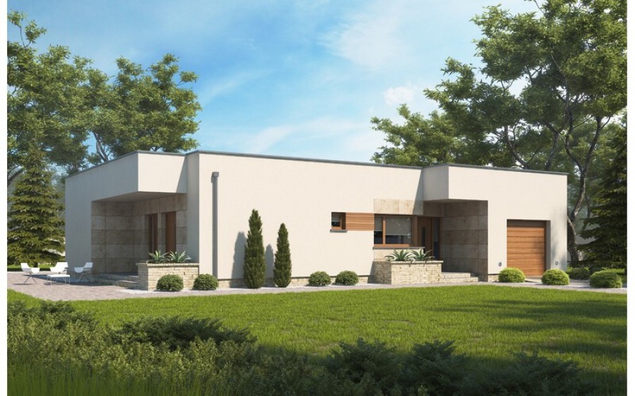 Projekt D135 jest funkcjonalnym domem parterowym z nowoczesną architekturą dedykowany 4 osobowej rodzinie. Strefa dzienna to duży, wygodny salon wraz z jadalnią i funkcjonalną, widną kuchnią. Strefa nocna została wyraźnie wydzielona i składają się na nią dwa pokoje z osobną łazienką oraz główna sypialnia z łazienką i garderobą. Garaż jednostanowiskowy wraz z kotłownią oraz spiżarnia to dodatkowe atuty tego domu.
