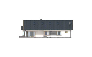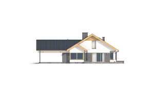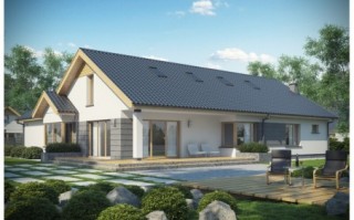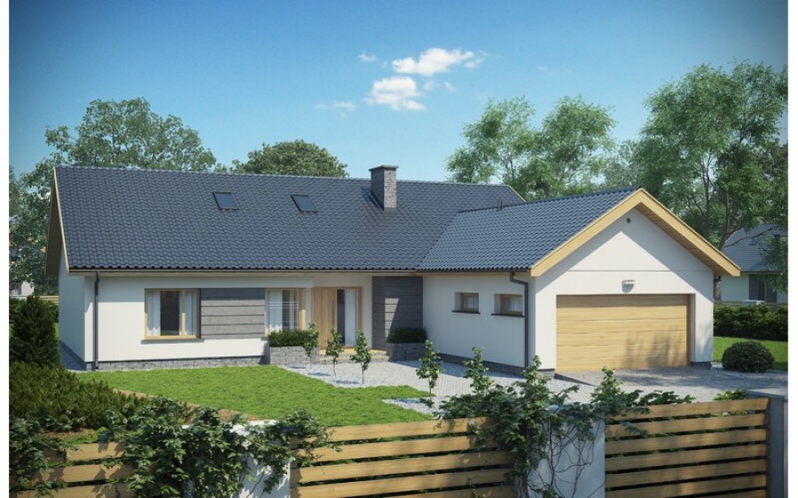 Dom jednorodzinny parterowy z poddaszem do adaptacji i garażem, niepodpiwniczony. Idealny dla 4-6 osobowej rodziny. Ciekawa, nowoczesna bryła budynku oraz kolorystyka są dużym atutem tego domu. Duży taras oraz wykusz dopełniają całości. Dal zmotoryzowanych członków rodziny zaprojektowana wygodny, dwustanowiskowy garaż. Bardzo funkcjonalny podział pomieszczeń z oddzielną strefą techniczną.