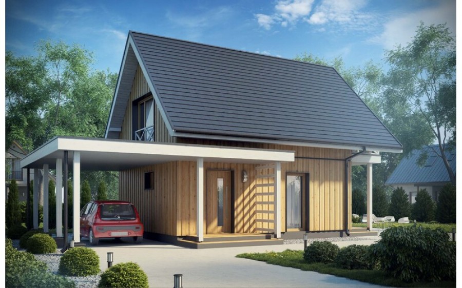 Miejsce parkingowe w postaci wiaty, zaprojektowano obok budynku. Bardzo funkcjonalny podział pomieszczeń z oddzielną strefą techniczną, strefą dzienną na parterze i nocną na poddaszu.