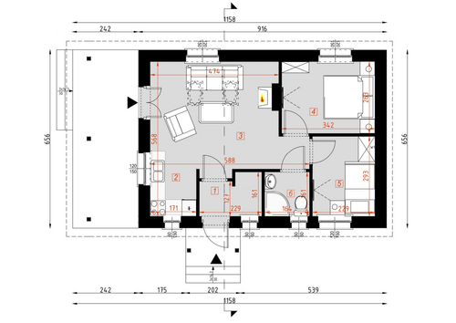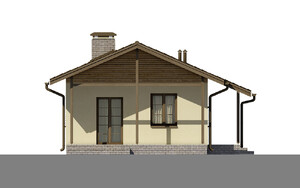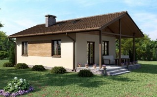Dom mieszkalny jednorodzinny, wolnostojący. Parter składa się ze stosunkowo dużego pokoju dziennego połączonego z korytarzem prowadzącym do pokoi oraz sieni wejściowej, dwóch pokoi sypialnych, kuchni, łazienki i pomieszczenia technicznego.