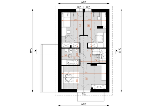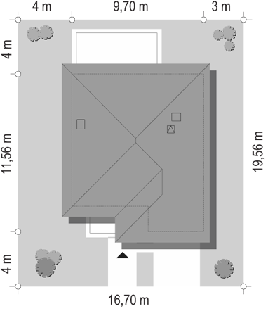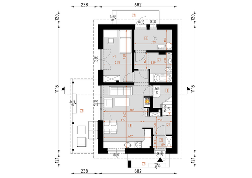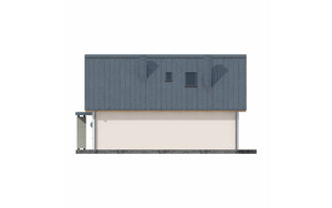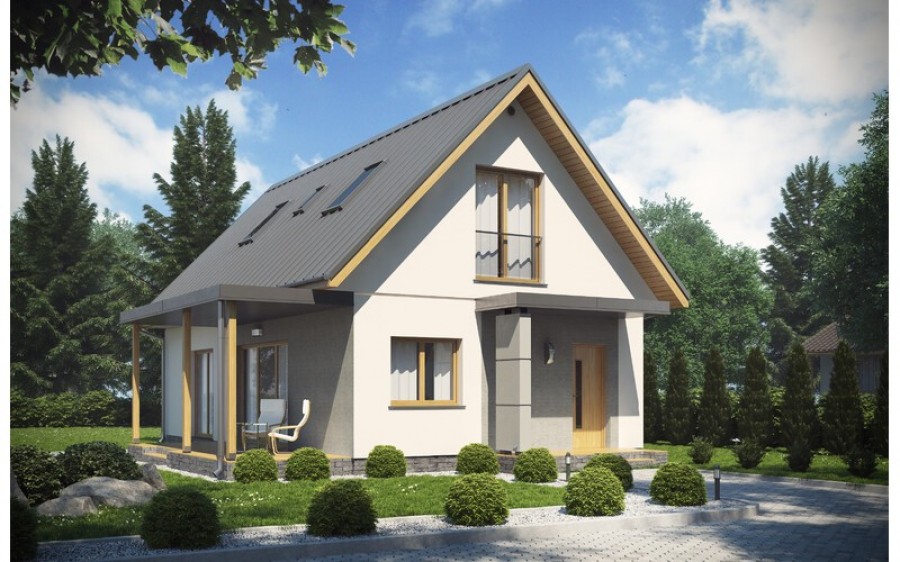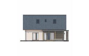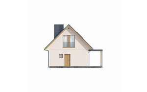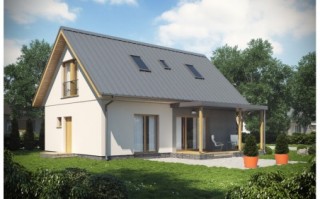 Dom mieszkalny jednorodzinny wolnostojący, parterowy z poddaszem użytkowym. Parter składa się z pokoju dziennego połączonego z kuchnią, łazienki, pokoju sypialnego oraz pomieszczenia technicznego dostępnego z drugiej strony domu. Na poddaszu znajdują się 3 pokoje. Budynek idealny na wąską działkę.