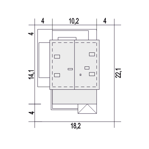 Dom jednorodzinny z poddaszem użytkowym. Na parterze znajduje się salon wraz z kominkiem, połączony z kuchnią, oraz gabinet i łazienka. Z korytarza mamy bezpośredni dostęp do garażu jednostanowiskowego. Na parterze znajduje się również niewielkie pomieszczenie techniczne. Na poddaszu mamy trzy pokoje w tym jeden z garderobą i łazienką oraz strych.